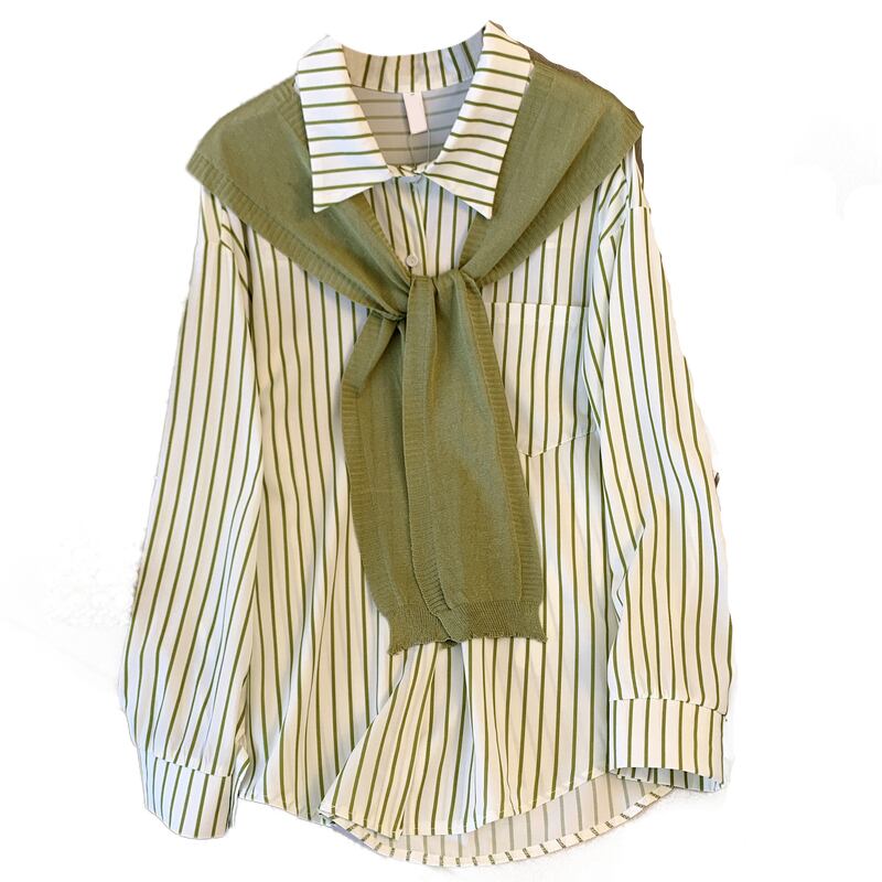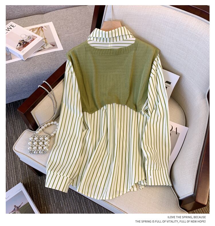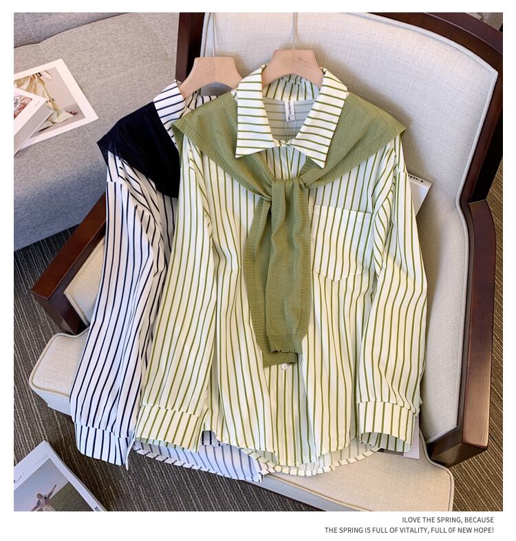 大きいサイズの婦人服 2022 秋の新しいファットシスターファッションデザインセンスショールルースストライプシャツツーピーススーツ 大きめサイズ オータム 秋物 8884178295147481