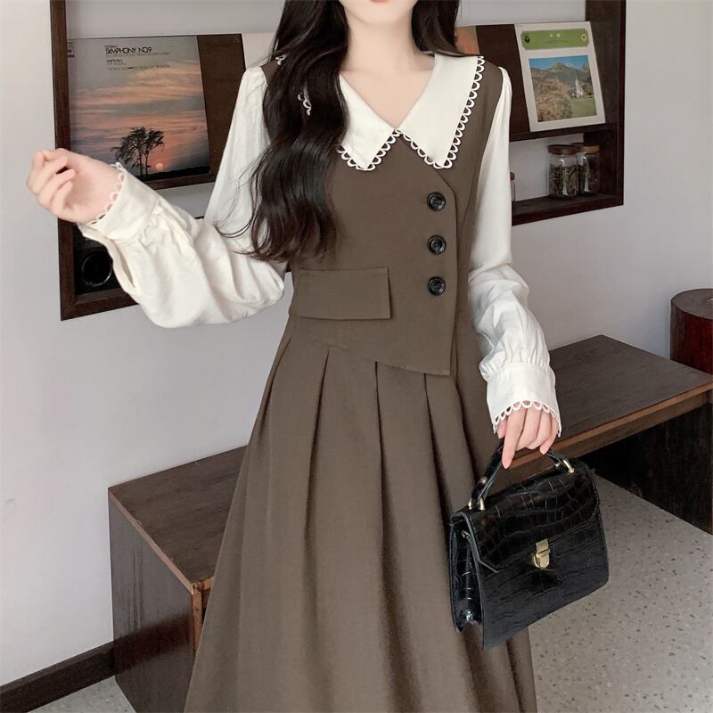 大きいサイズの婦人服 2022 ファットシスター秋の新しい人形の襟のデザインセンスレトロなステッチフェイクツーピースドレス 大きめサイズ オータム 秋物 8884183213650856