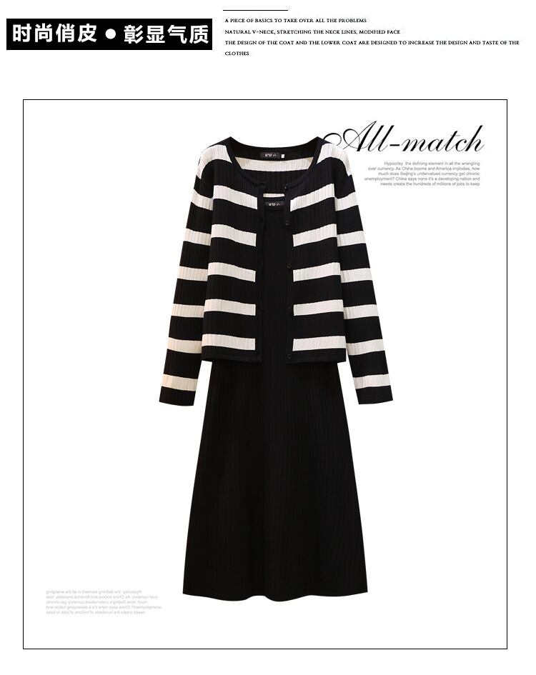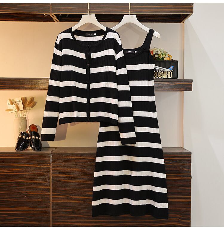 大きいサイズの婦人服 2022 ファットシスター秋の新しいストライプの薄いセーターカーディガンサスペンダードレス 2 点セット 大きめサイズ オータム 秋物 8884117432962720