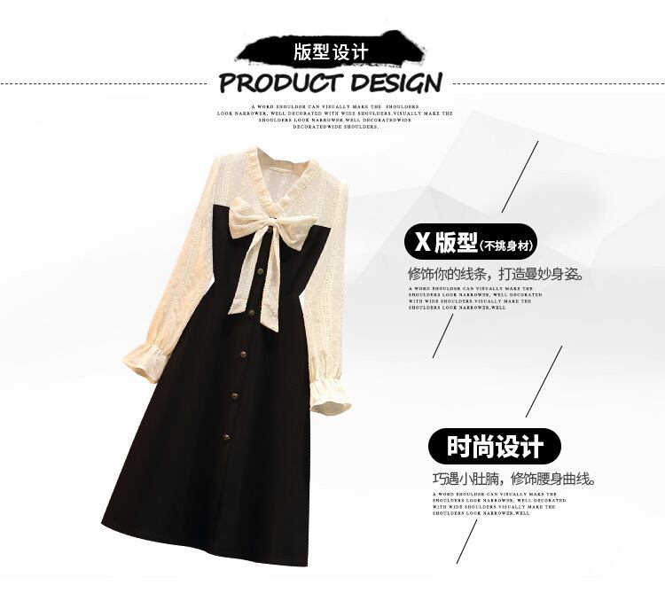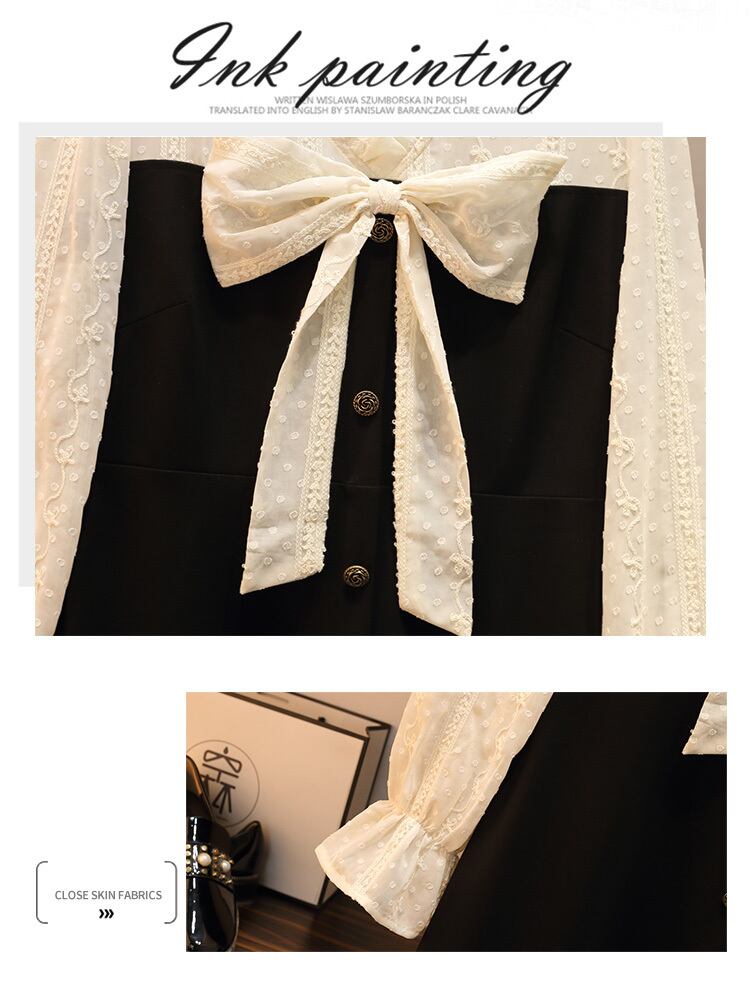 大サイズの女性の 2022 秋の新しいファットシスターフランスのレトロなステッチ弓フェイクツーピースウエストドレス リボン 大きめサイズ オータム 秋物 88841350492172