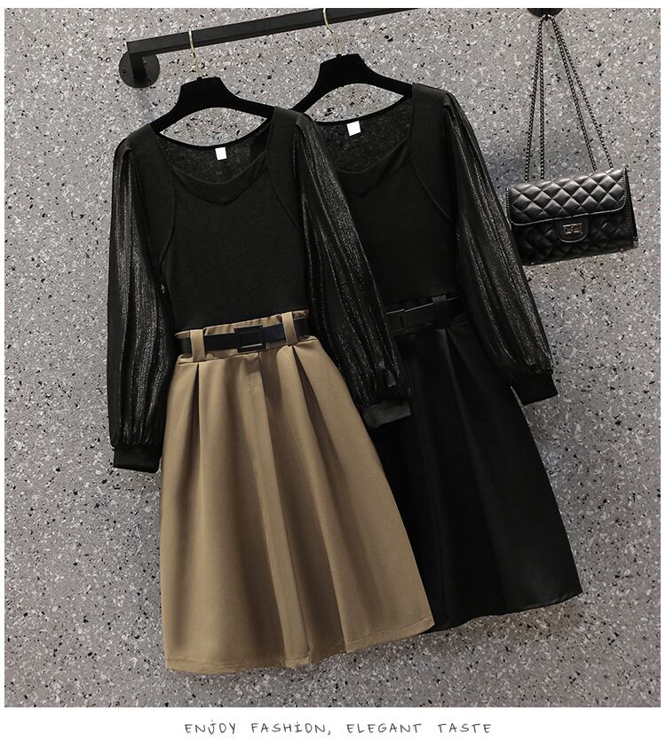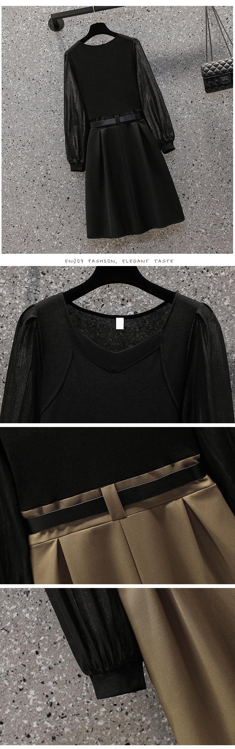 大きいサイズの婦人服2022ファットシスター秋の新しいスタイルの気質のウエストと薄いステッチの偽のツーピースのドレス 大きめサイズ オータム 秋物 8884164940136250
