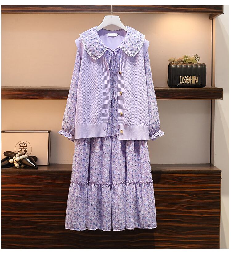 大きいサイズの婦人服 2022 トレンディな女性の秋の新しいファットシスターニットベスト花柄ベストセータードレス 2 点セット 大きめサイズ オータム 秋物 8884179311902592
