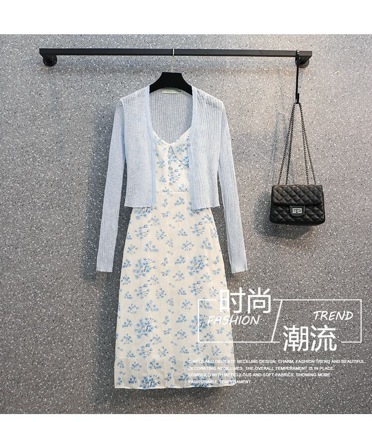 大きいサイズの婦人服 2022 脂肪姉妹夏の新ファッション花柄サスペンダードレススリムニットセーター 2 点セット 大きめサイズ サマー 夏物 8884137078346947