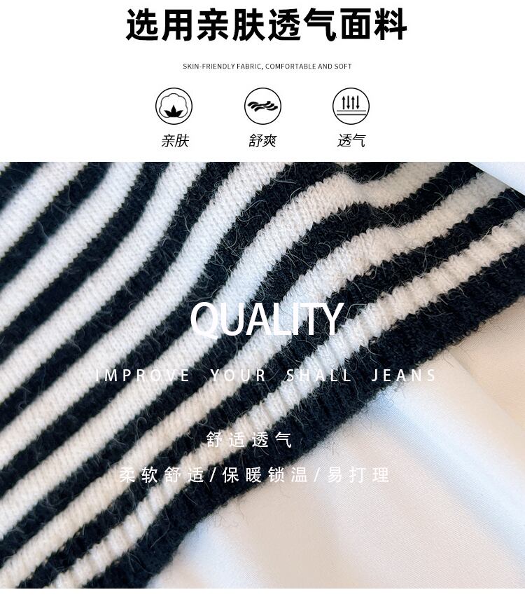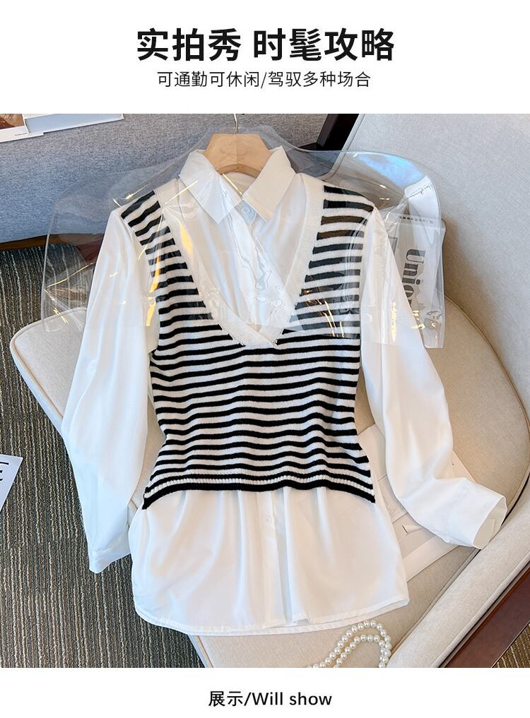 大サイズの婦人服 2022 ファットシスター秋新スタイル薄いステッチストライプニットベストフェイクツーピース長袖シャツ ロング 大きめサイズ オータム 秋物 8884114020575401