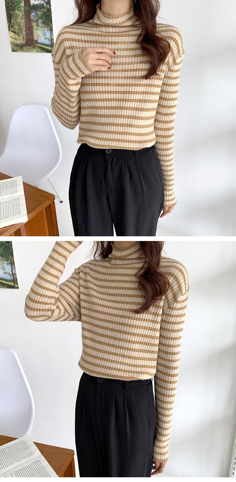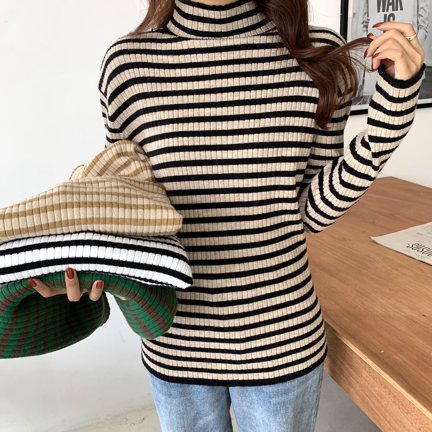 色:黒と白のストライプのミッドネック,イエローミッドネック,緑の中襟,カーキミッドネック,黒と白のストライプのタートルネック,イエロータートルネック,グリーンハイカラー,カーキタートルネック