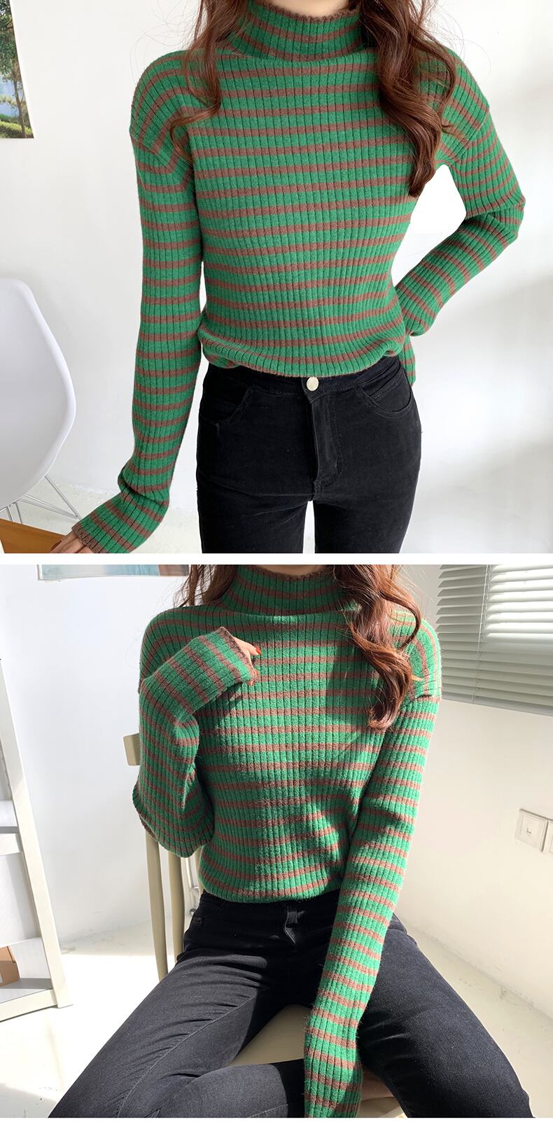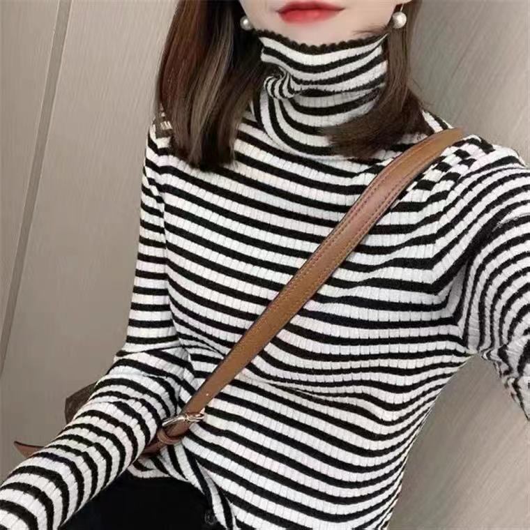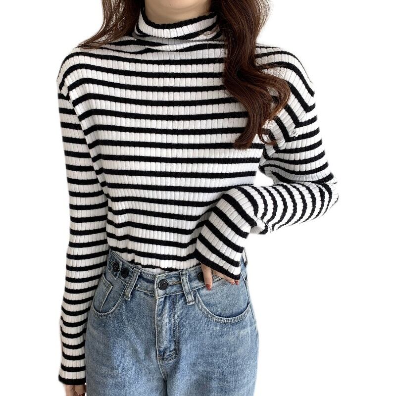 大きいサイズの婦人服 2022 ファットシスター秋の新しいハイネックストライプトップ長袖プルオーバーニット底入れセーター ロング 大きめサイズ オータム 秋物 8884112299916746