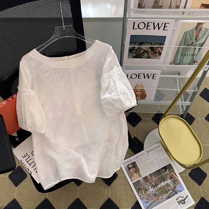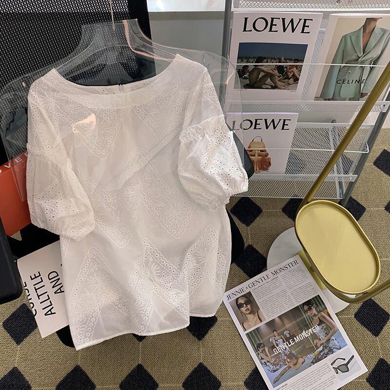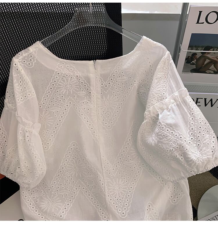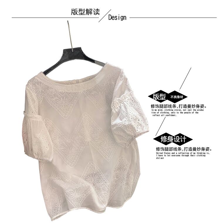 大きいサイズの婦人服 2022 太った姉妹の夏の新しいスタイルの痩身中空ホック花半袖洋風デザイン レース トップ 大きめサイズ サマー 夏物 フラワーデザイン 8884129042805891