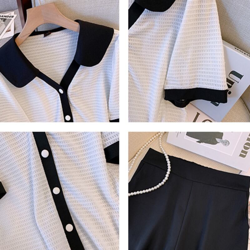 大きいサイズの婦人服 2022 トレンディな女性の夏の新しい太った姉妹ファッション ハイエンド コントラスト カラー Tシャツ ハイウエスト ショーツ ツーピース スーツ 大きめサイズ サマー 夏物 ブルマー 8884166803353542
