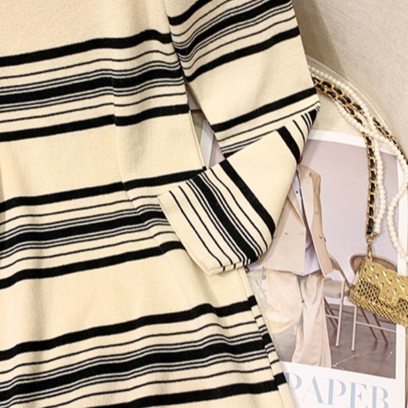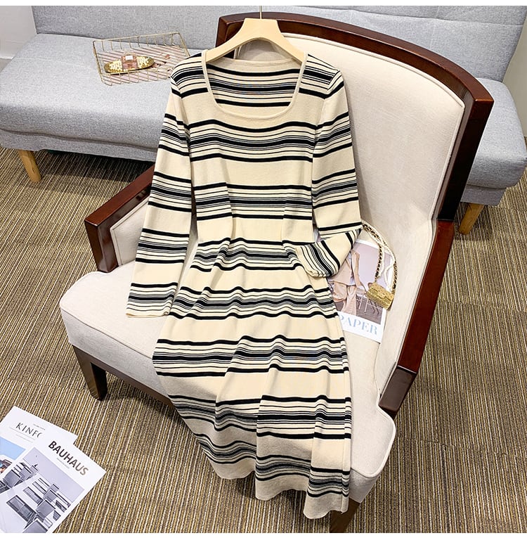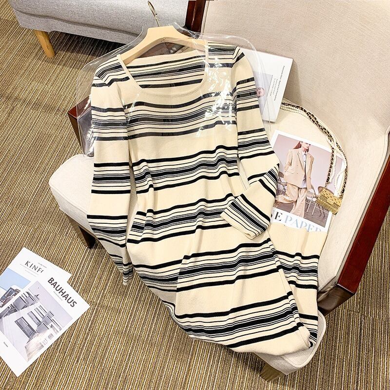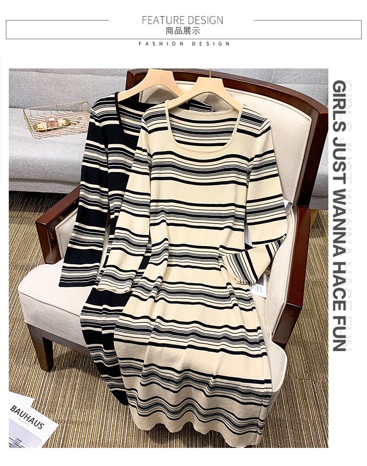 大サイズの婦人服 2022 秋の新ファットシスターファッションデザインセンススクエアカラー肉カバーストライプニットドレス女性 大きめサイズ オータム 秋物 スクウェア 8884157575525336