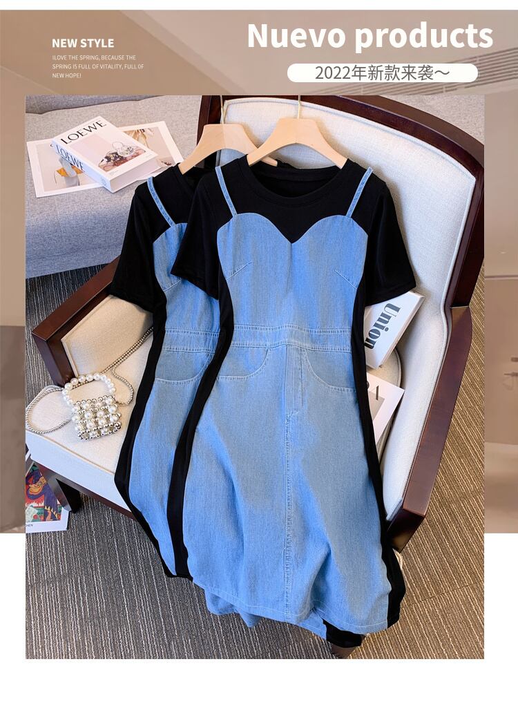 大サイズの婦人服 2022 夏の新脂肪姉妹ファッション気質ステッチ偽ツーピースウエストカバードレス女性 大きめサイズ サマー 夏物 88841822138597
