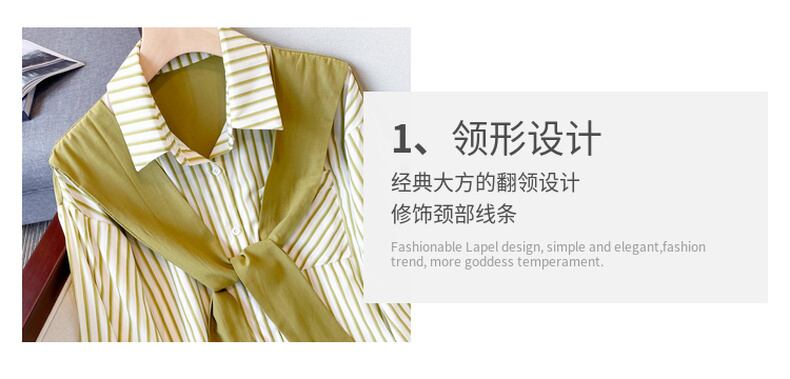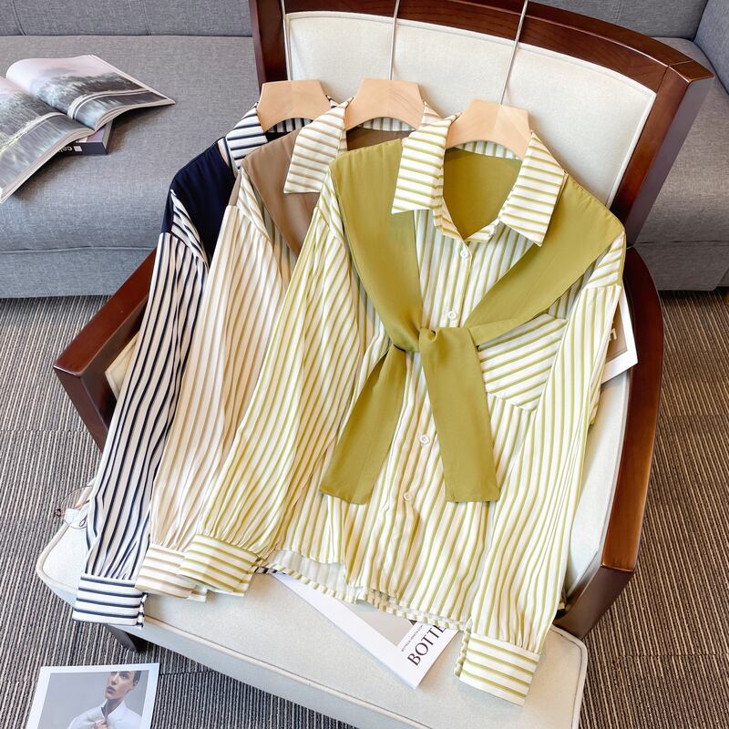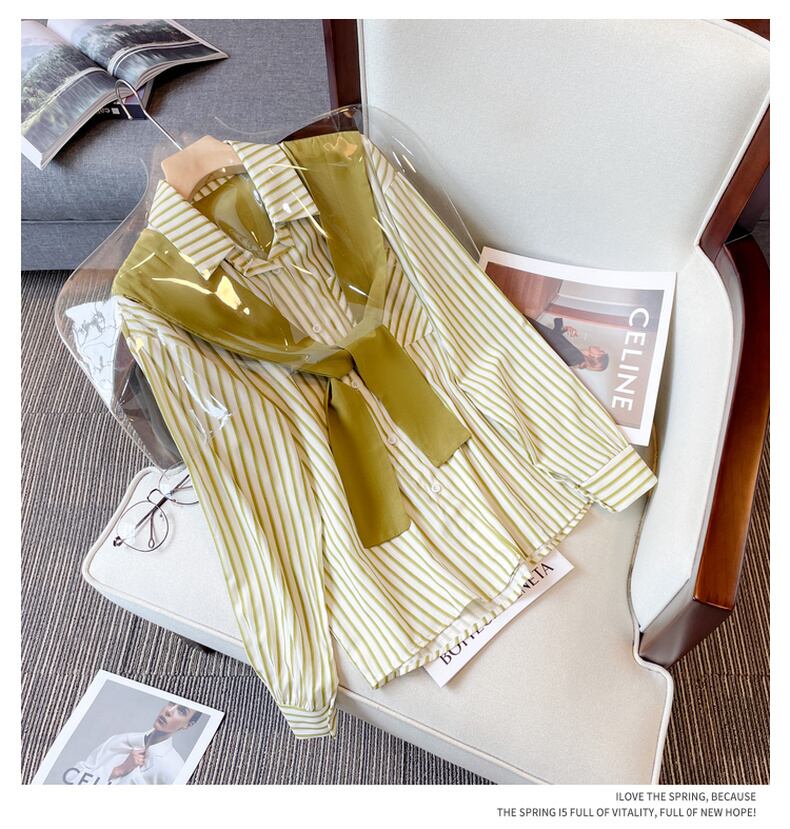 大きいサイズの婦人服 2022 秋の新しいファットシスターファッション薄い気質ステッチフェイクツーピースストライプの年齢を減らすシャツ 大きめサイズ オータム 秋物 8884134822821787