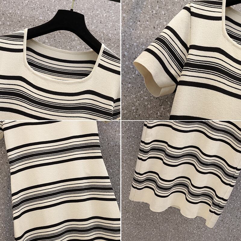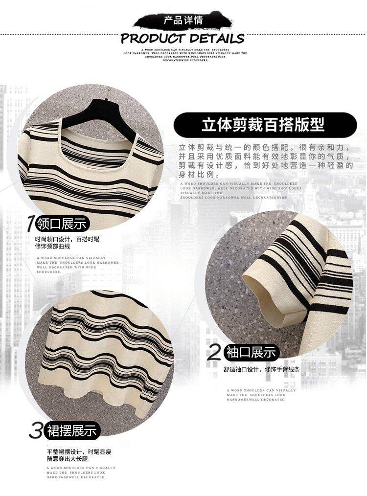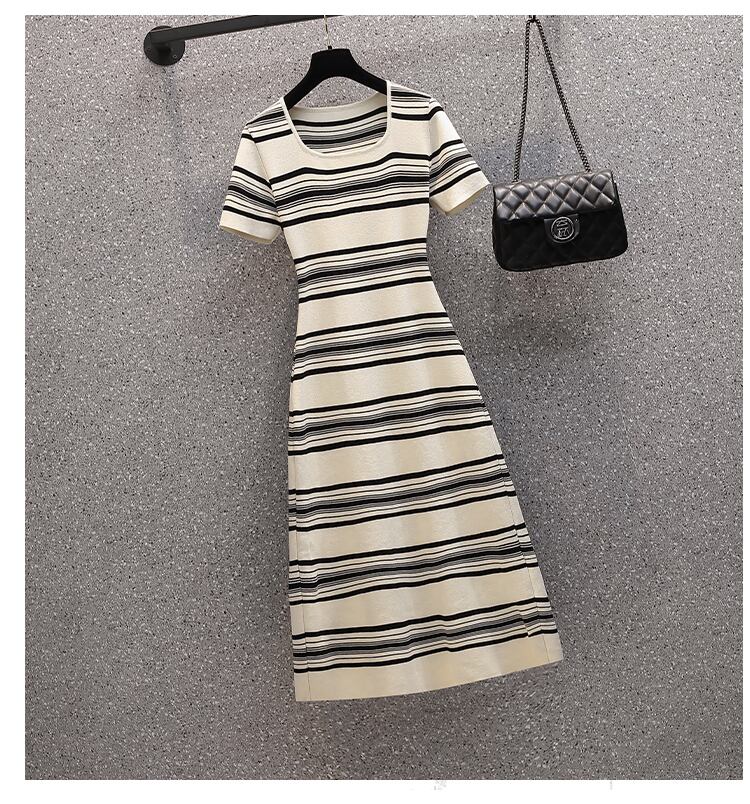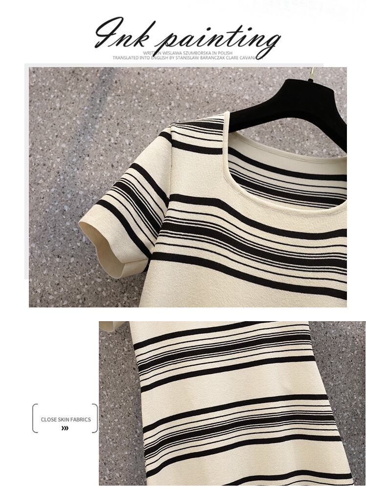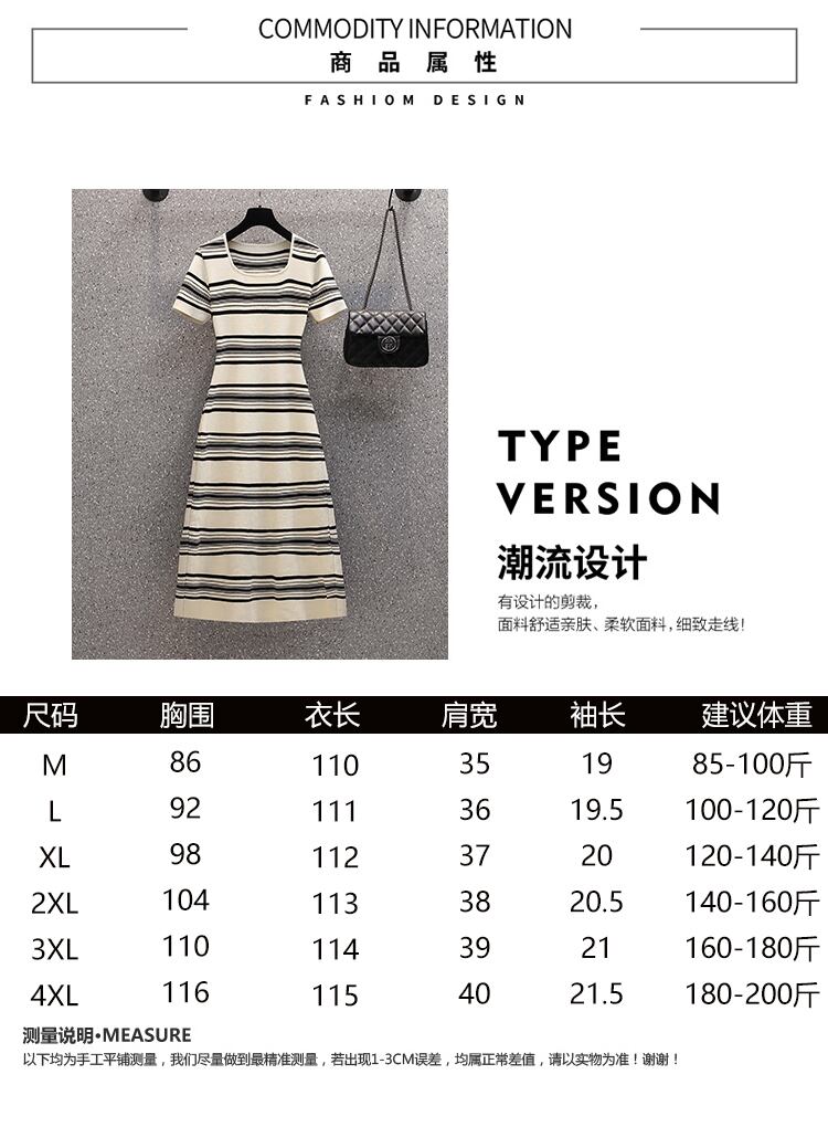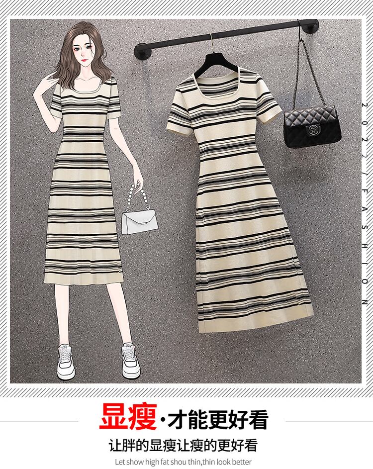 大きいサイズの婦人服2022ファットシスター夏の新しいフレンチUネックウエストスリムニットストライプドレス 大きめサイズ サマー 夏物 8884172881730984