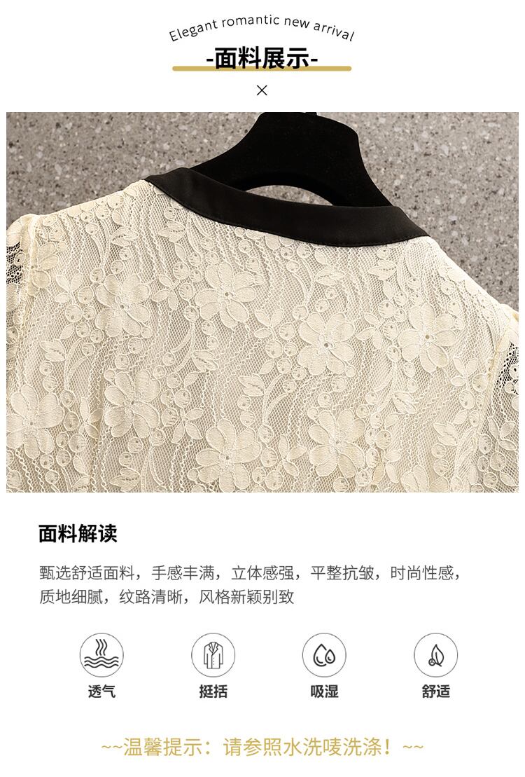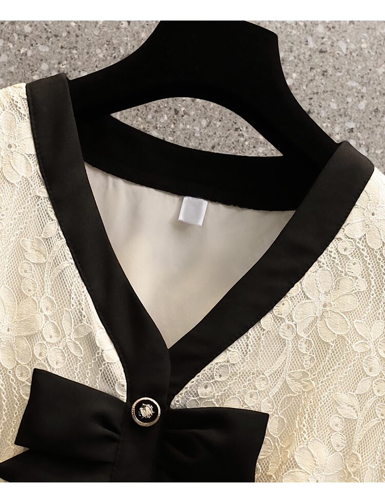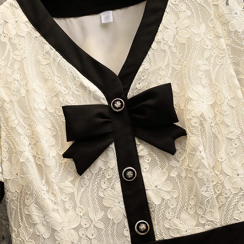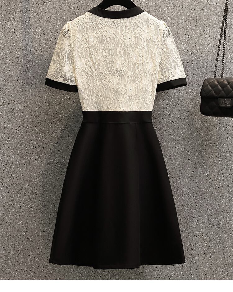 大きいサイズの婦人服 2022 ファットシスター夏の新しいフレンチボウレースステッチハイウエスト半袖ドレス ハイウェスト ショート リボン ハーフスリーブ 大きめサイズ サマー 夏物 8884138282790586