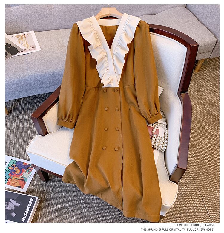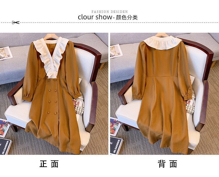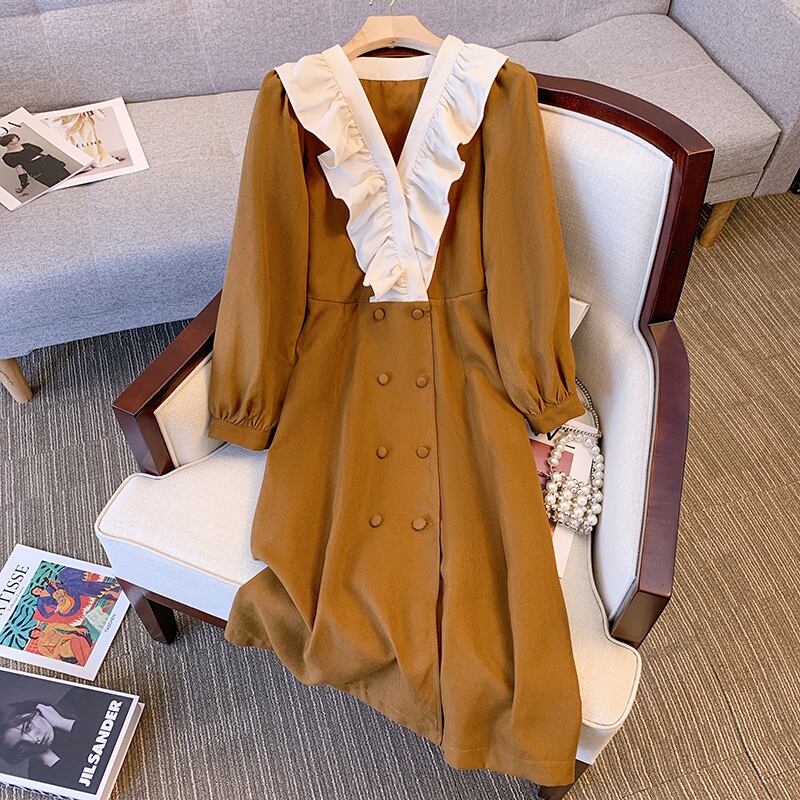 大サイズの婦人服 2022 秋の新ファットシスターレトロフレンチ気質スリム V ネックフリルドレス女性 大きめサイズ オータム 秋物 Vネック 888414977427727