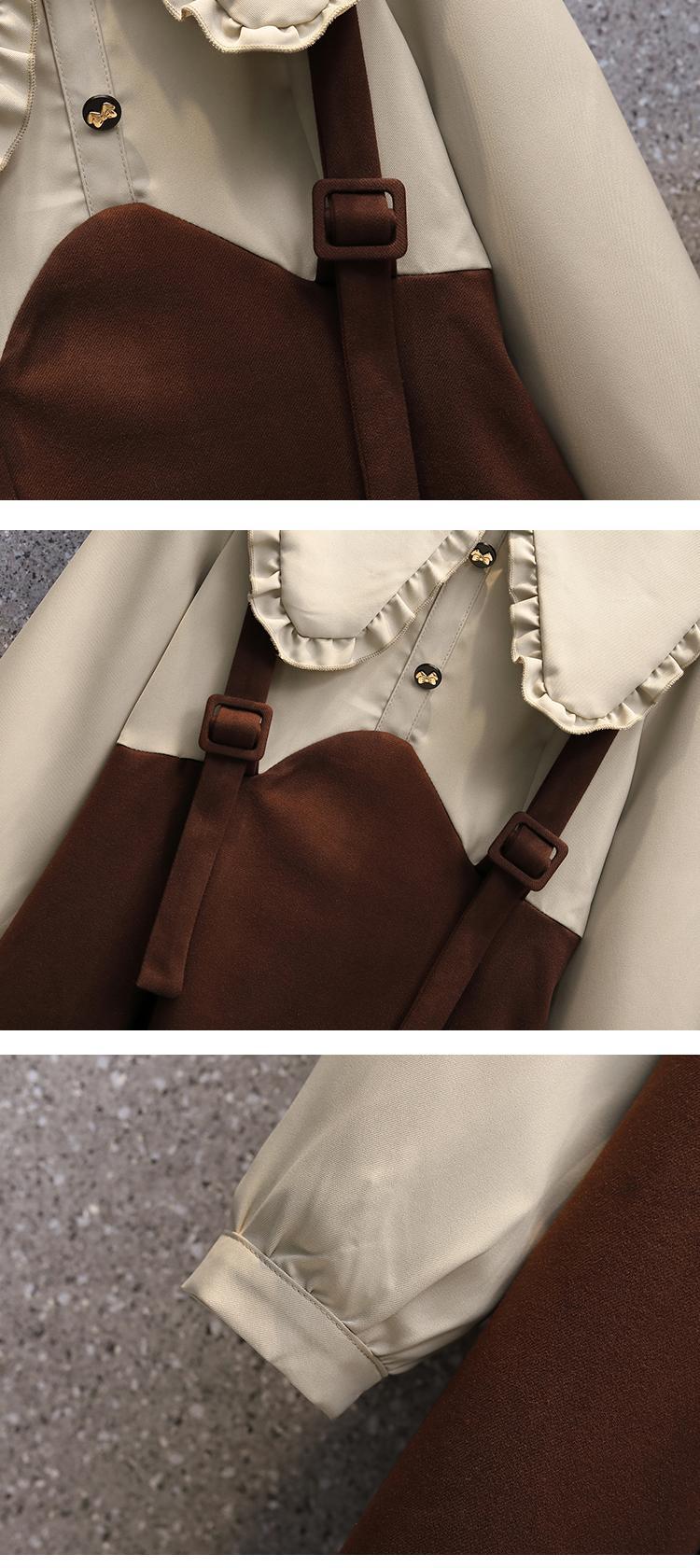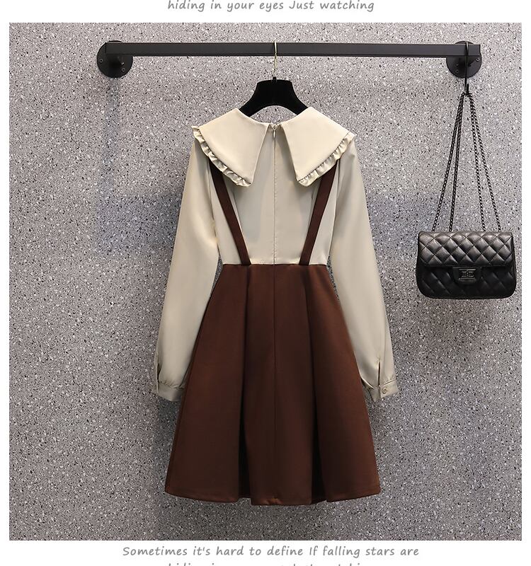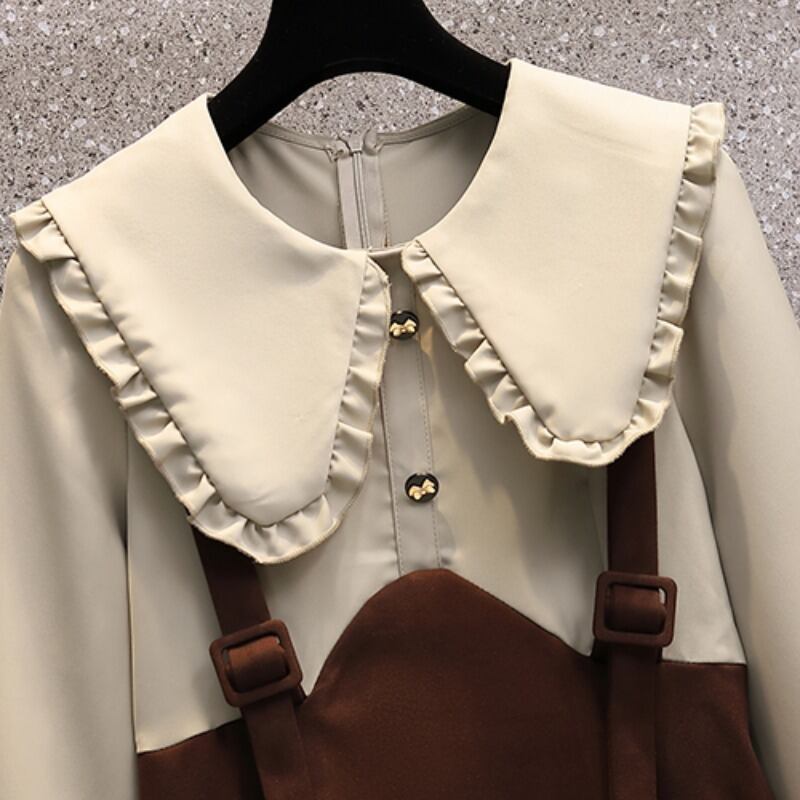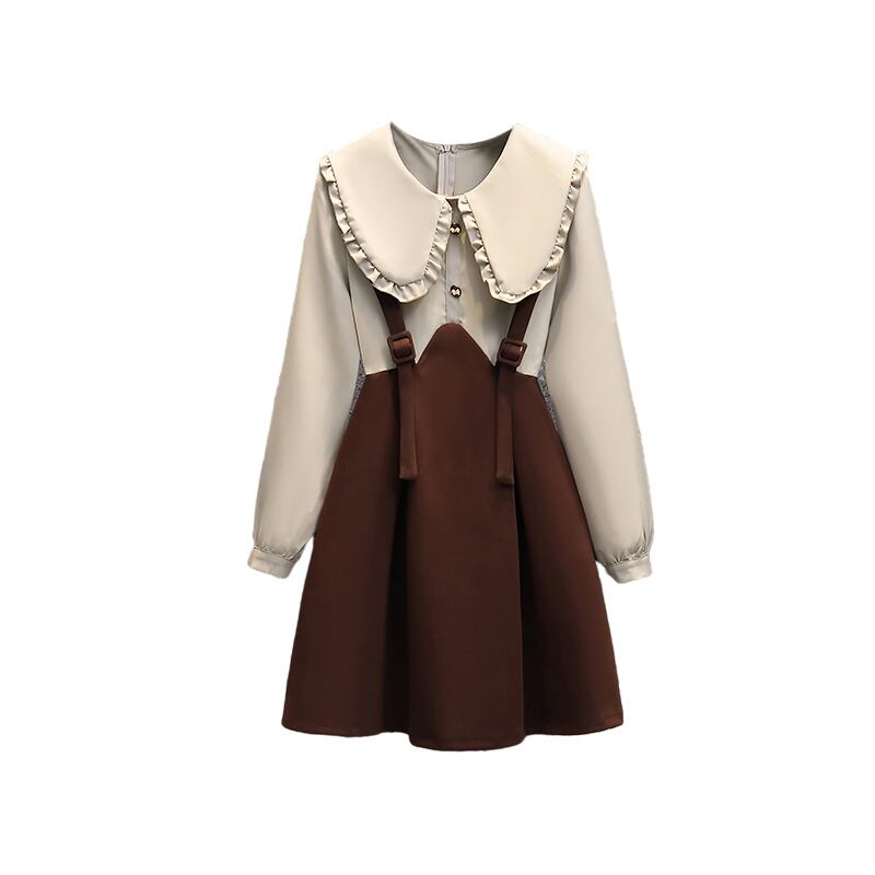 大きいサイズの婦人服 2022 ファットシスター秋の新しいフレンチスタイルの薄い人形の襟ステッチ長袖フェイクツーピースドレス ロング 大きめサイズ オータム 秋物 8884146011965808
