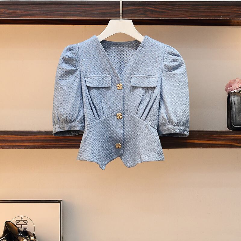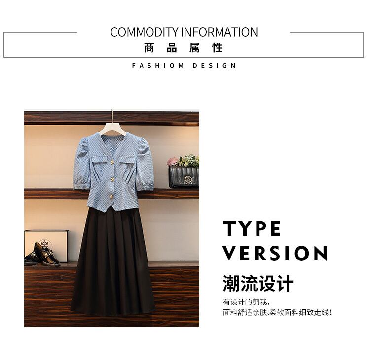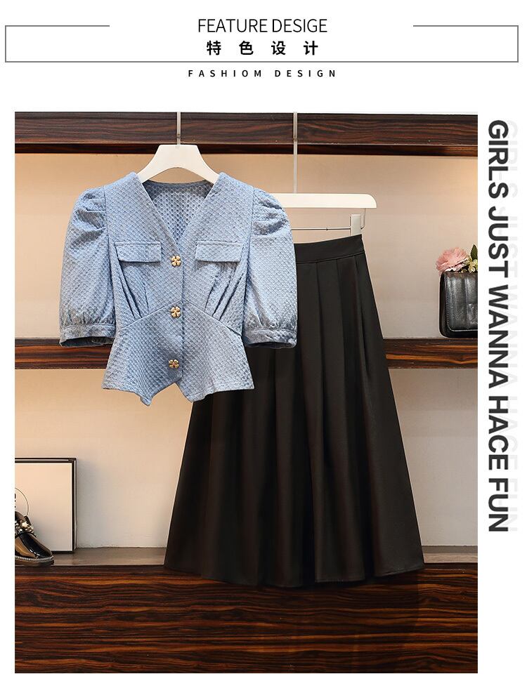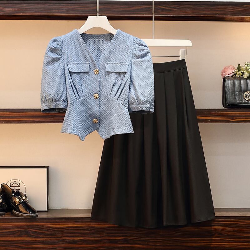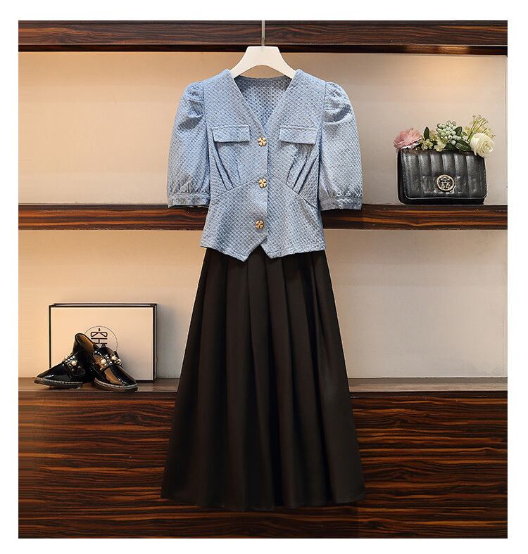 大きいサイズの婦人服 2022 ファットシスター夏の新しいスタイルの痩身デニムシャツトップハーフスカート 2 点セット 大きめサイズ サマー 夏物 8884173929110063