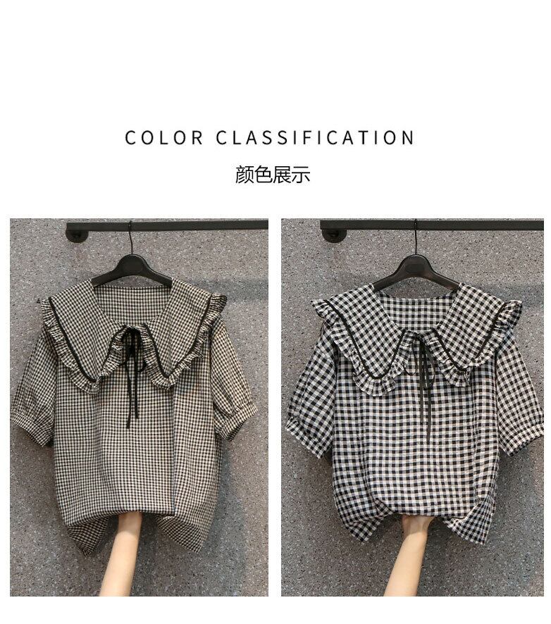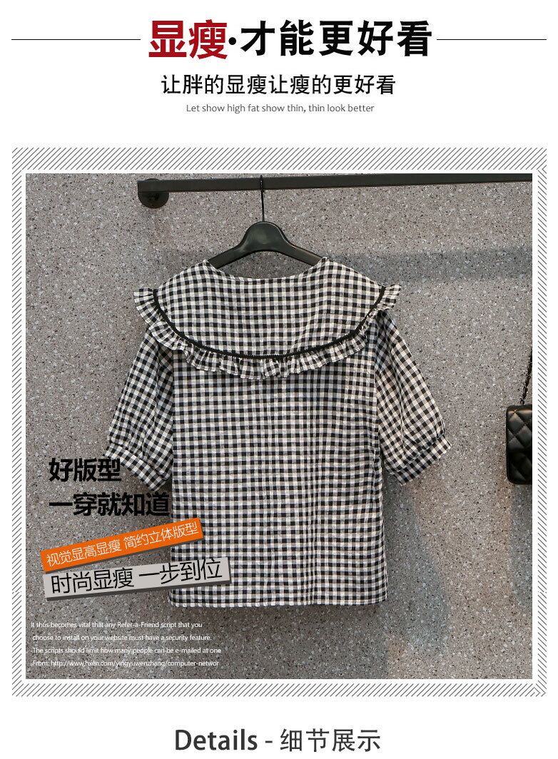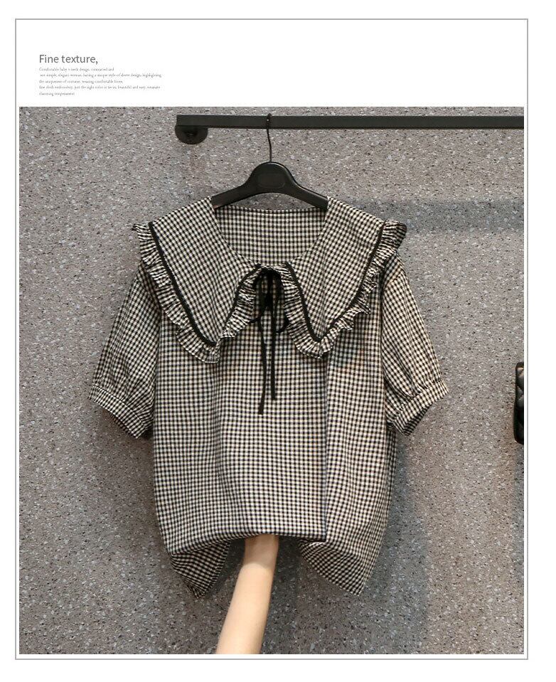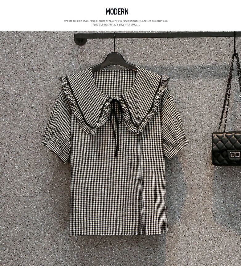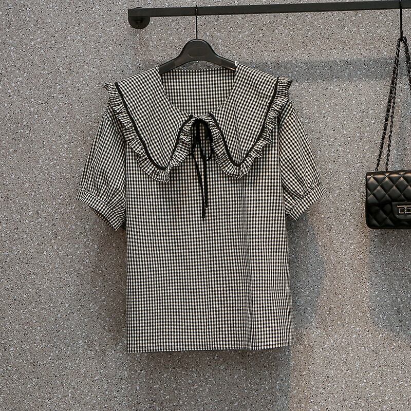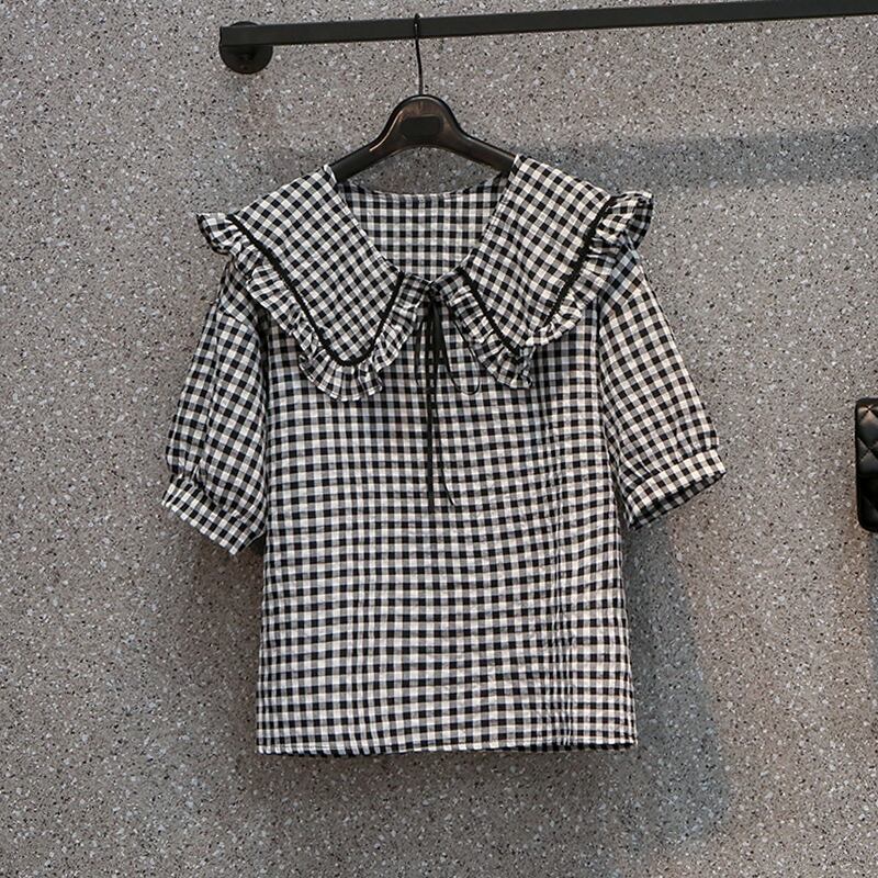 大きいサイズの婦人服 2022 ファットシスター夏の新しい人形の襟黒と白のグリッドルーズで薄いシャツプルオーバー小さなシャツの女性 ホワイト ブラック 大きめサイズ サマー 夏物 8884120158581486