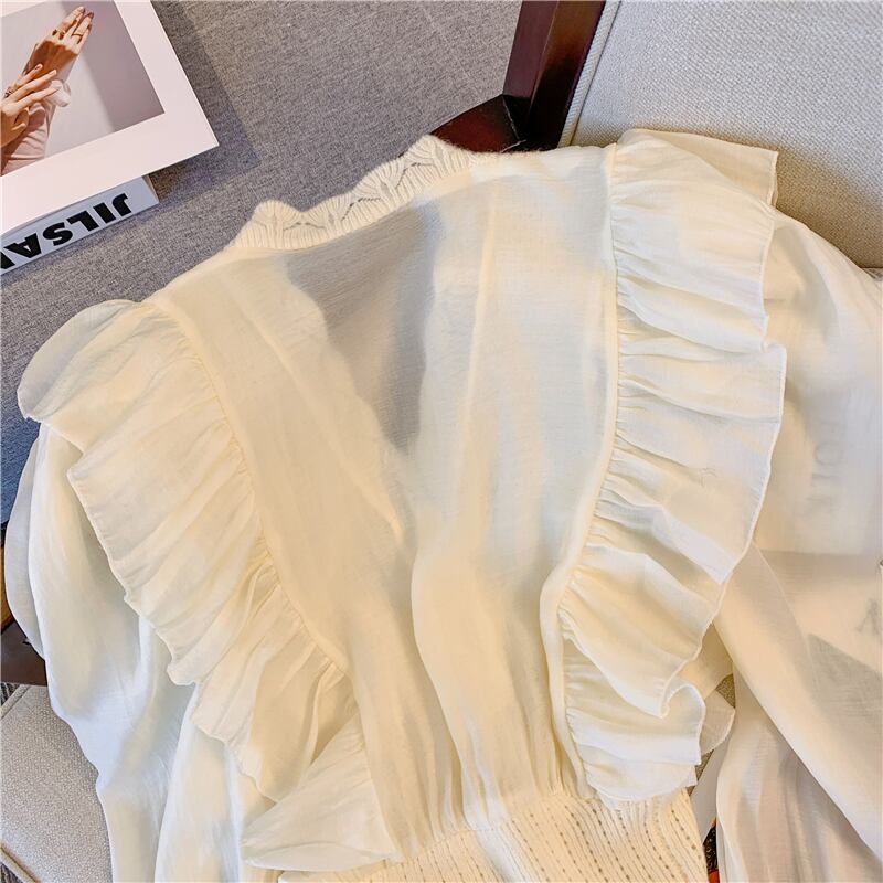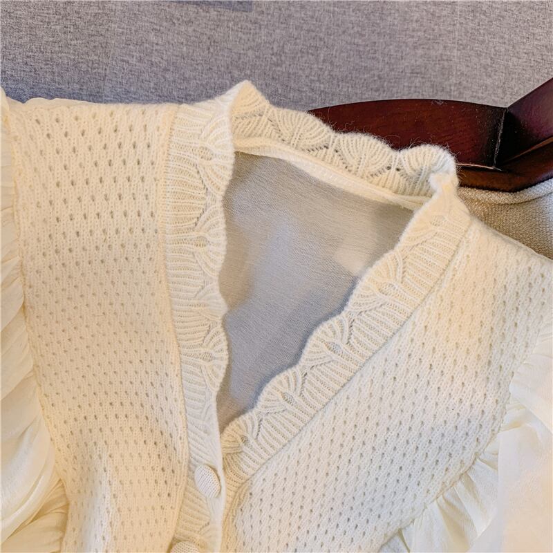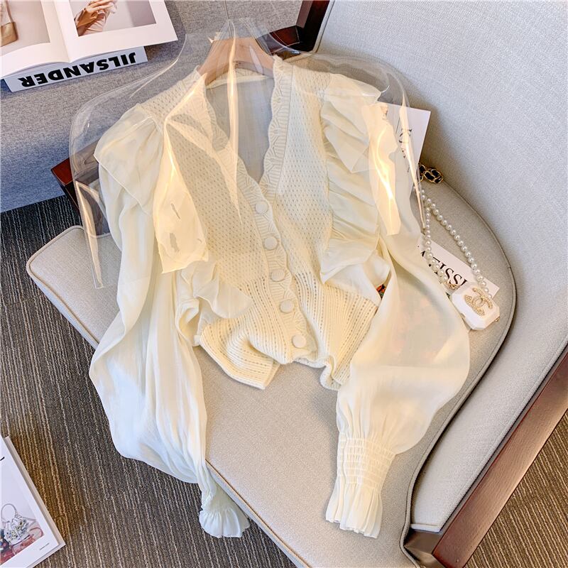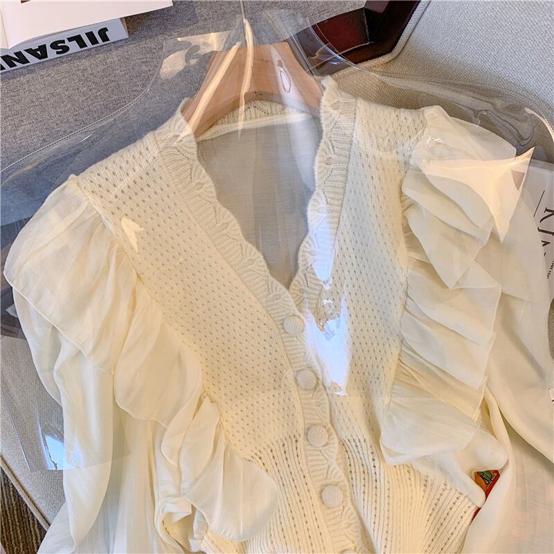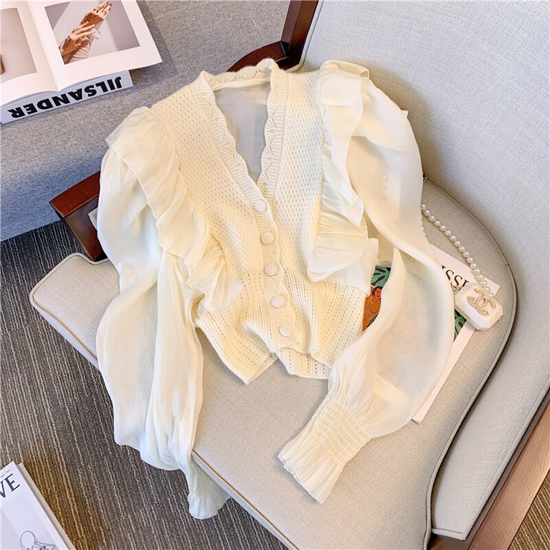 プラスサイズの女性の 2022 ファットシスター秋の新しいフリルステッチニットシャツフレンチ v ネックウエストトップ 大きめサイズ オータム 秋物 Vネック 8884175230380731