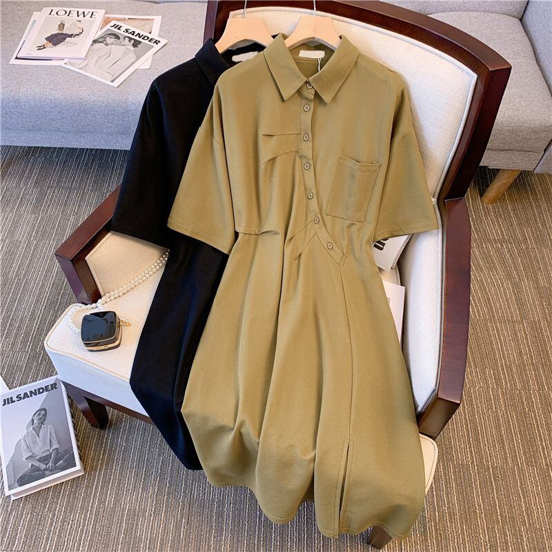大サイズの婦人服 2022 夏の新しいファットシスターファッション気質ウエストカバーデザインセンス無地ドレス女性 大きめサイズ サマー 夏物 ソリッドカラー 8884156496247935