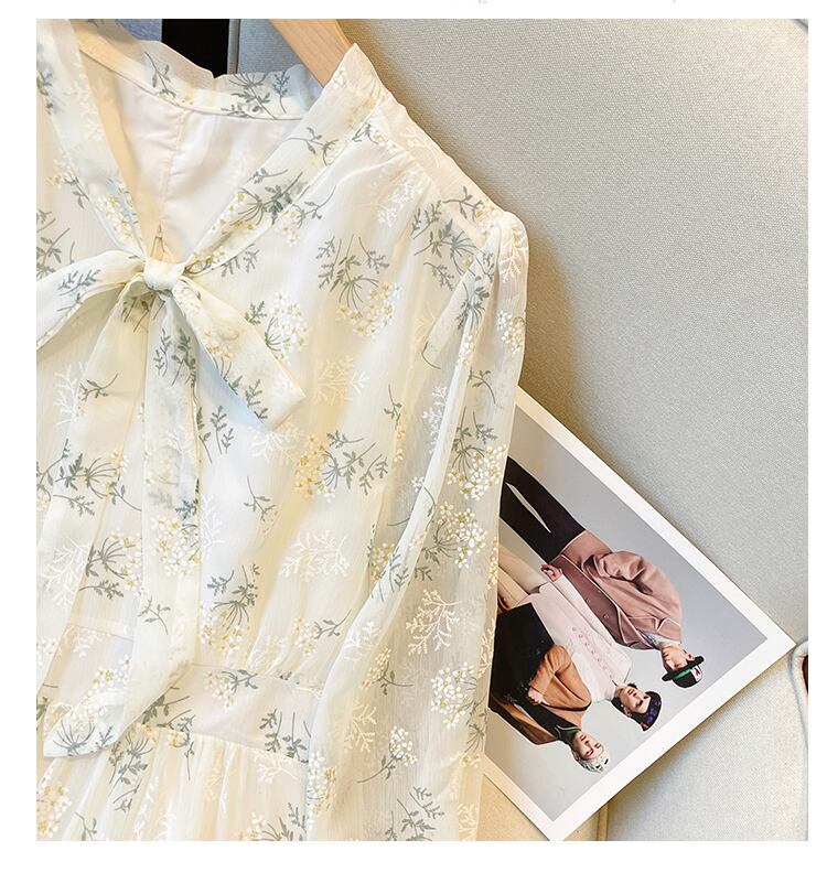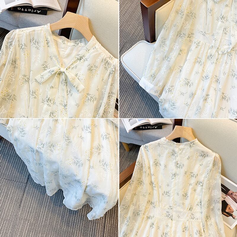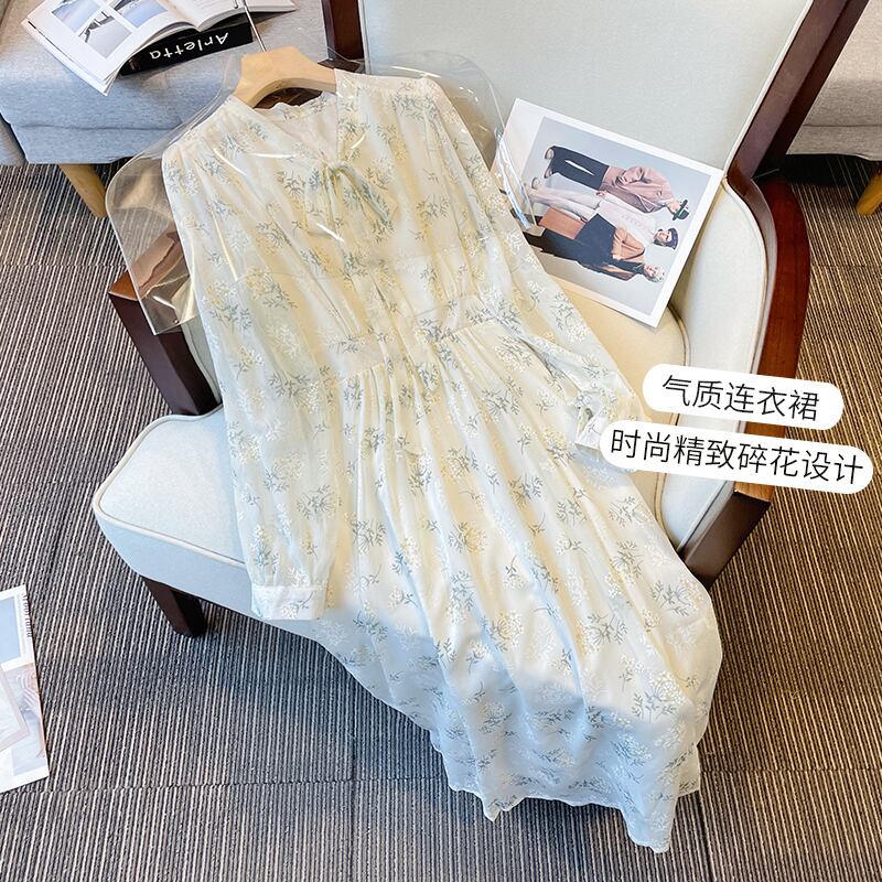 大きいサイズの婦人服 2022 ファットシスター秋の新しいスタイルの痩身と年齢を減らす弓プリント妖精のスカート長袖ドレス ロング リボン 大きめサイズ オータム 秋物 8884157631935520