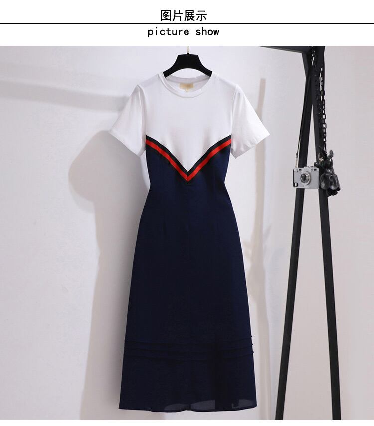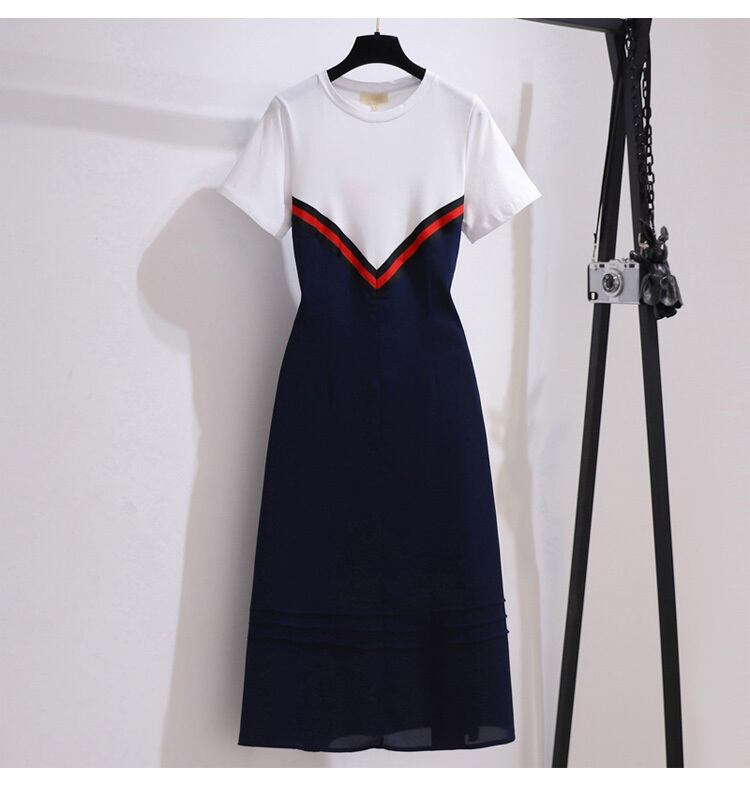 大きいサイズの婦人服 2022 ファット シスター夏の新しいスタイルの西洋風の妖精の年齢を減らした痩身コントラスト カラー ステッチ半袖ドレス 大きめサイズ サマー 夏物 8884118110800731
