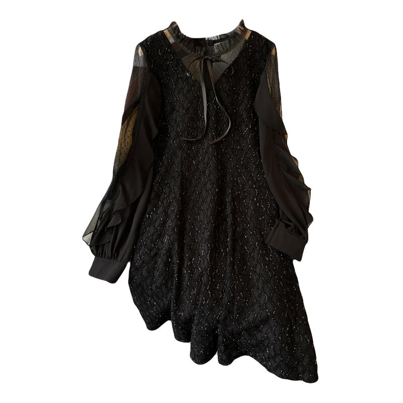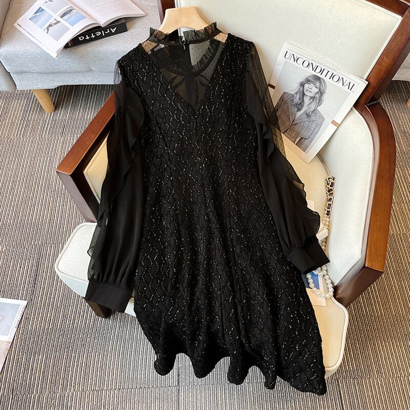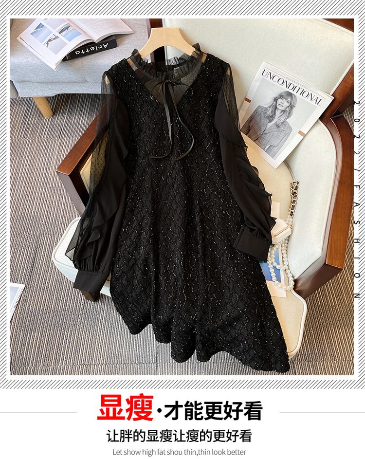 大サイズの婦人服 2022 ファットシスター秋新メッシュシフォンステッチ明るいシルクウエストウエスト長袖ドレス ロング 大きめサイズ オータム 秋物 8884197228995713