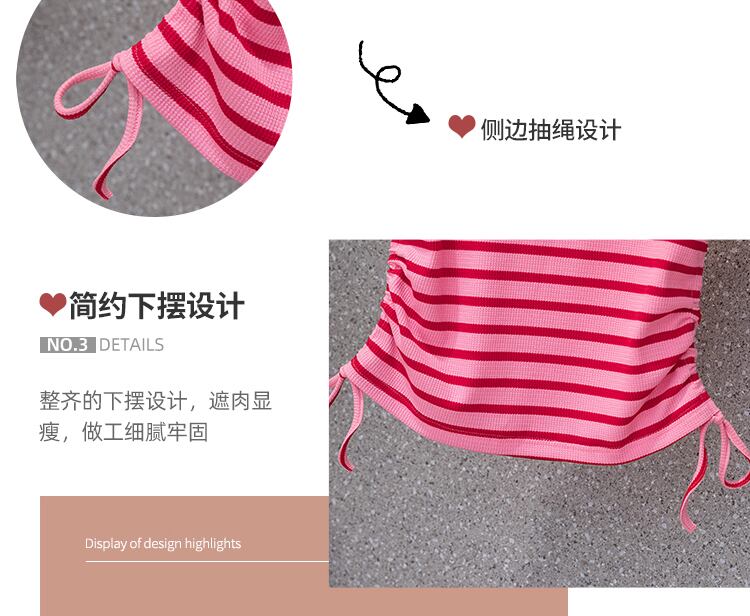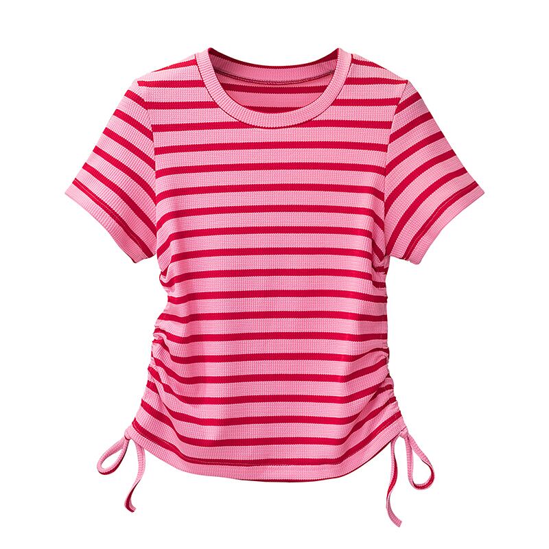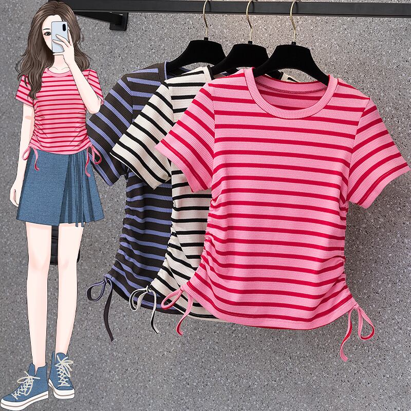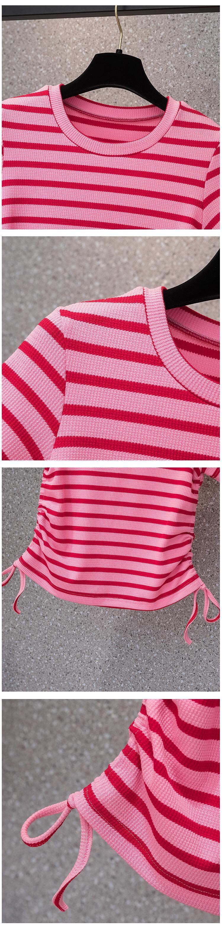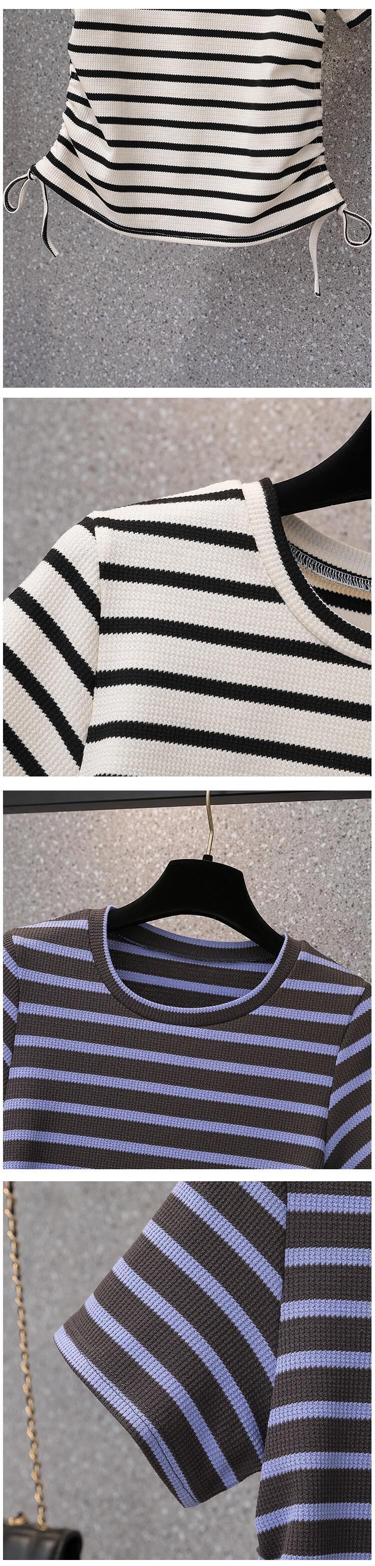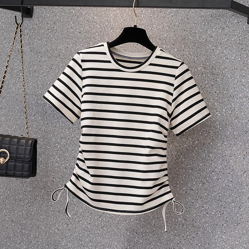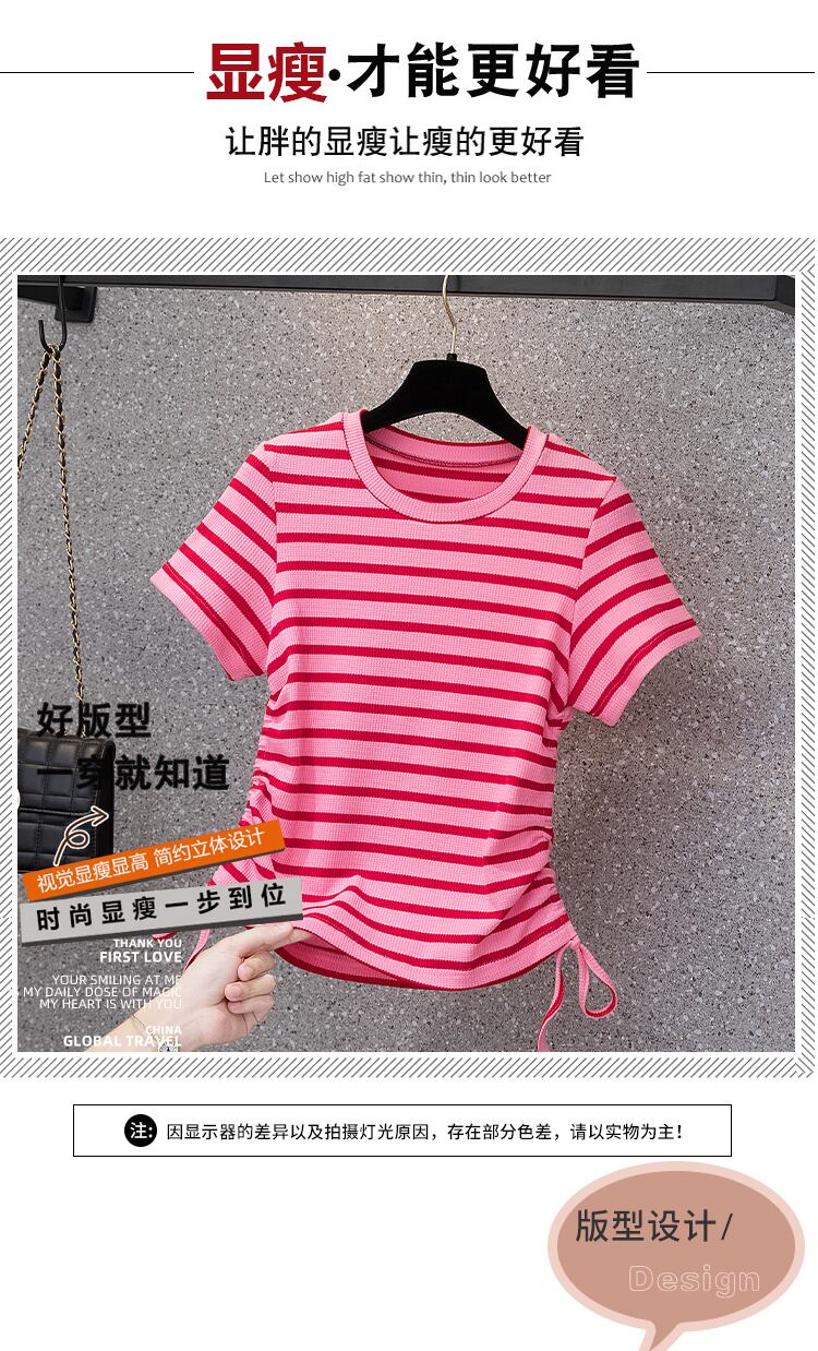 大きいサイズの婦人服 2022 脂肪姉妹夏新ストライプ半袖 Tシャツラウンドネック短いセクションスリムフィット薄いトップの女性 ショート 大きめサイズ サマー 夏物 Oネック 888412142555118