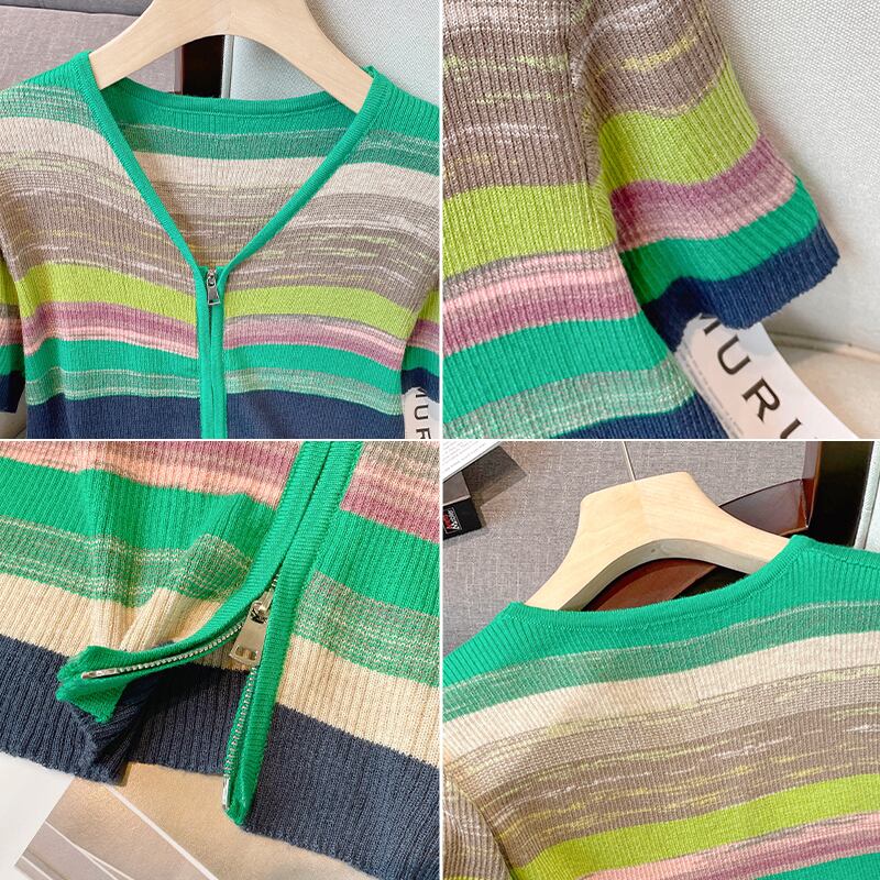 大きいサイズの婦人服 2022 ファットシスター夏の新ファッションカラーストライプ V ネックダブルジッパー痩身カーディガントップ 大きめサイズ サマー 夏物 Vネック 8884176228631862