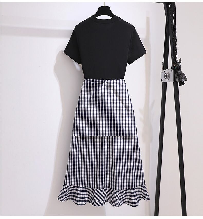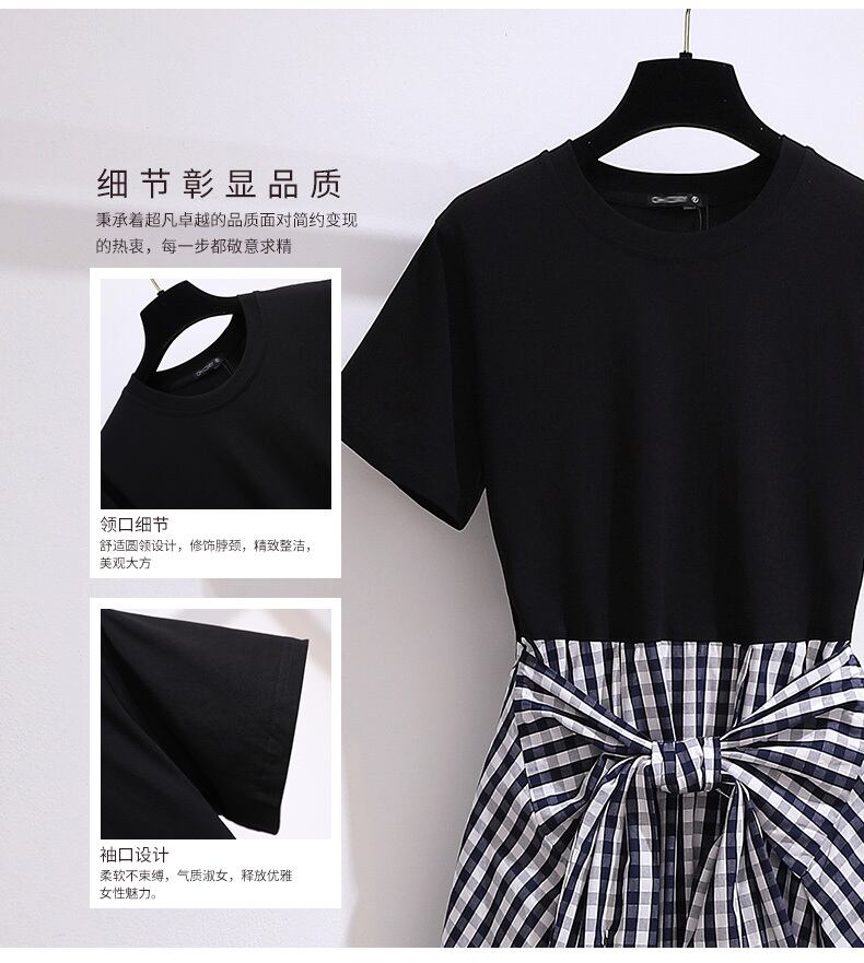 大きいサイズの婦人服 2022 ファットシスター夏の新しいスタイルのカバーお腹を薄く見せて年齢を減らすステッチフェイクツーピース半袖ドレス 大きめサイズ サマー 夏物 8884196511744935