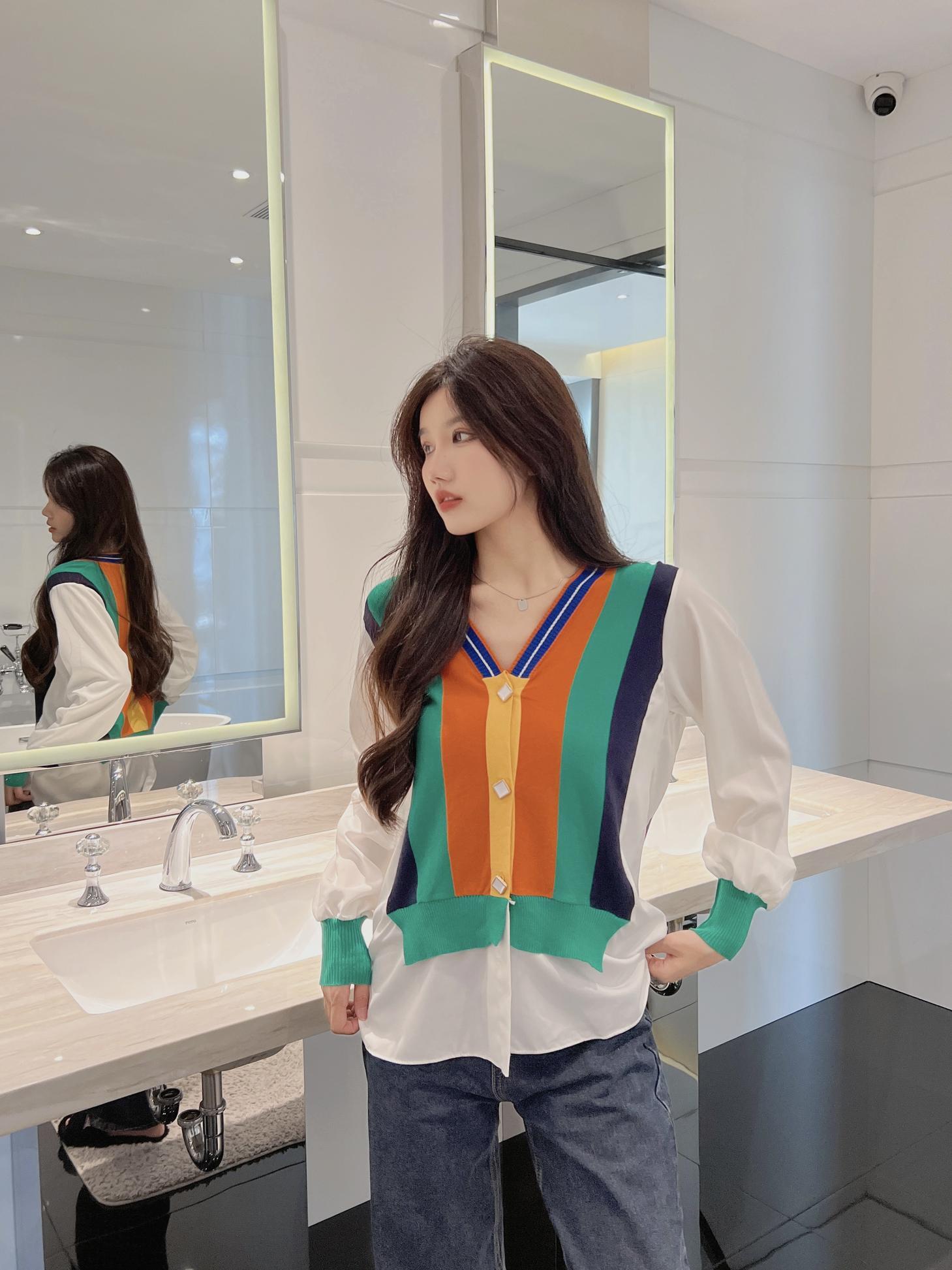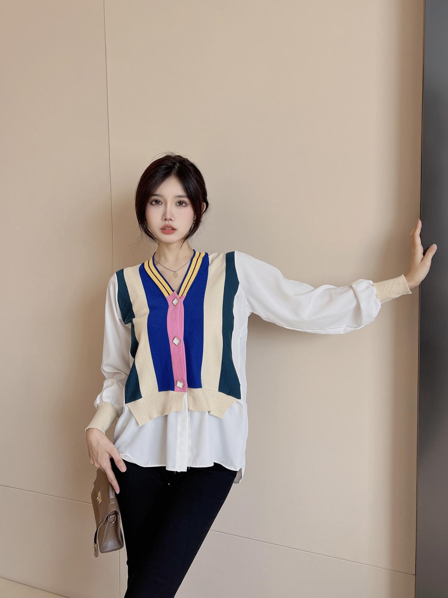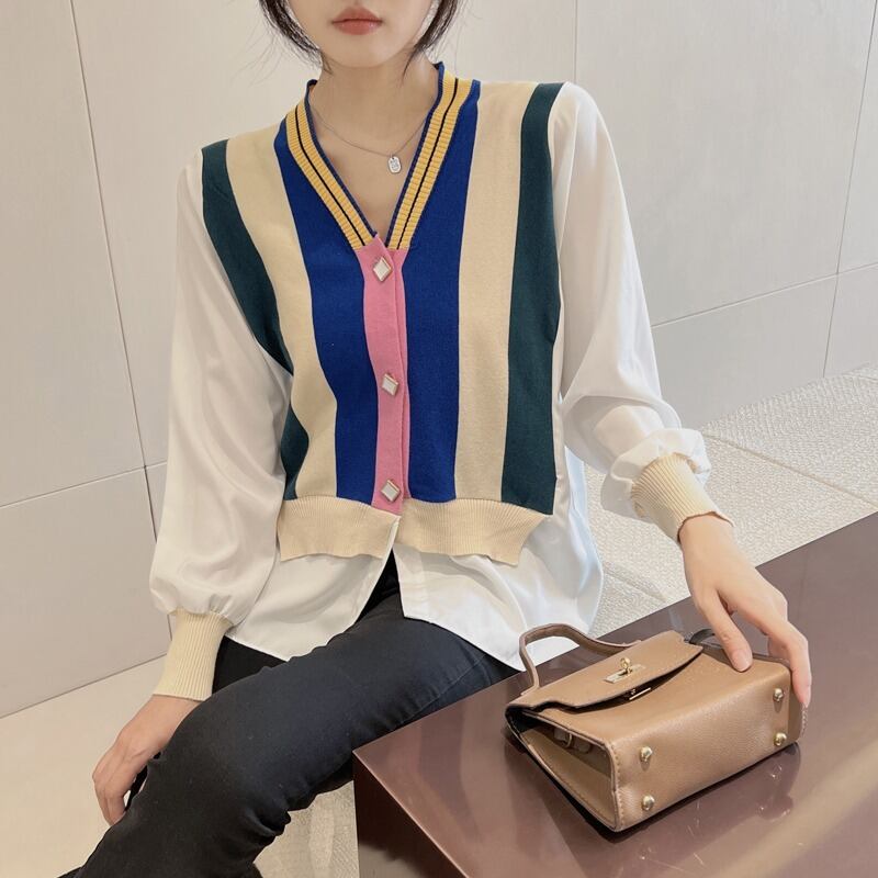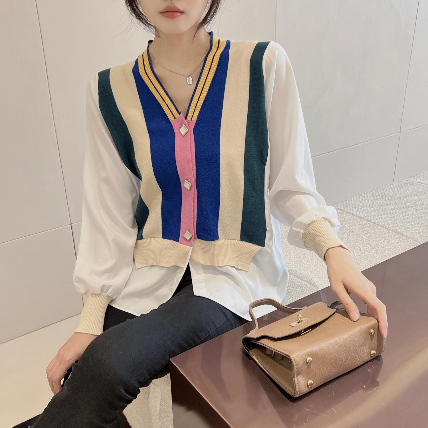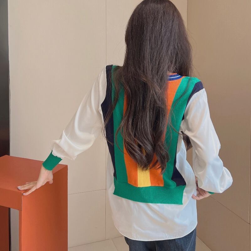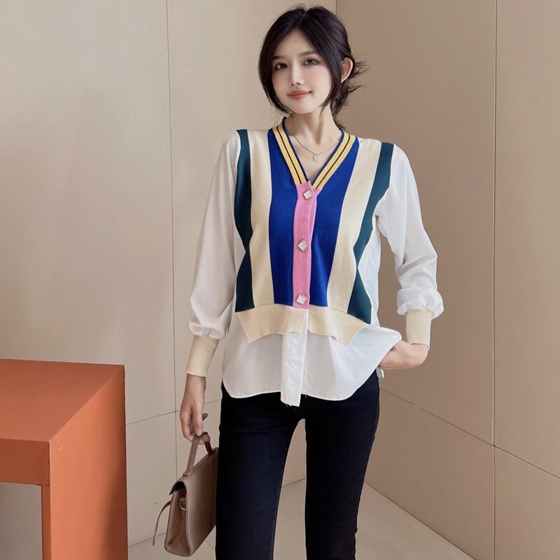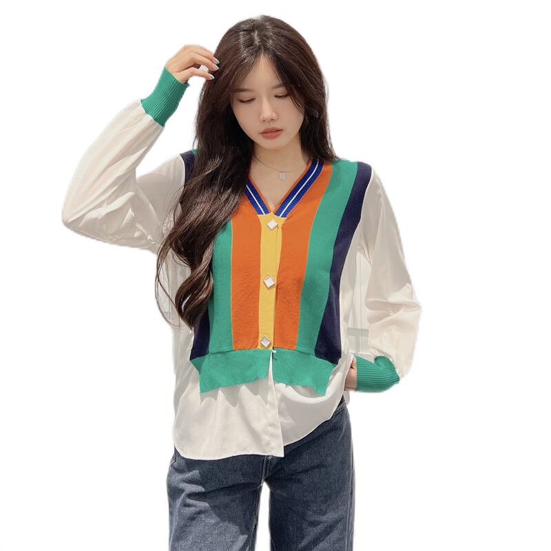 大きいサイズの婦人服 2022 流行の女性の秋の新しいファット シスター コントラスト カラー ステッチ ニット薄い V ネック フェイク ツーピース オールマッチ シャツ 大きめサイズ オータム 秋物 Vネック 8884170386961330