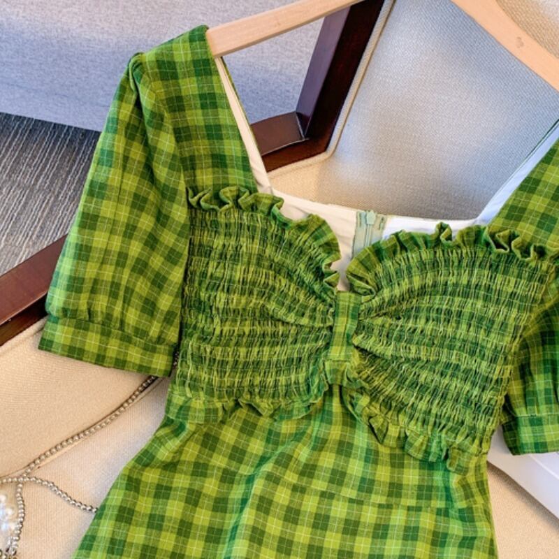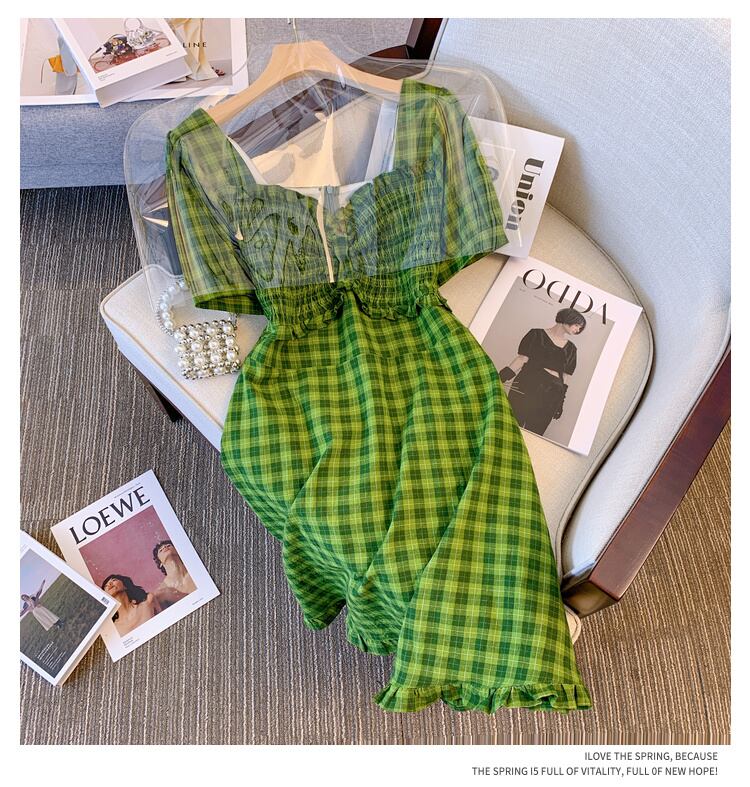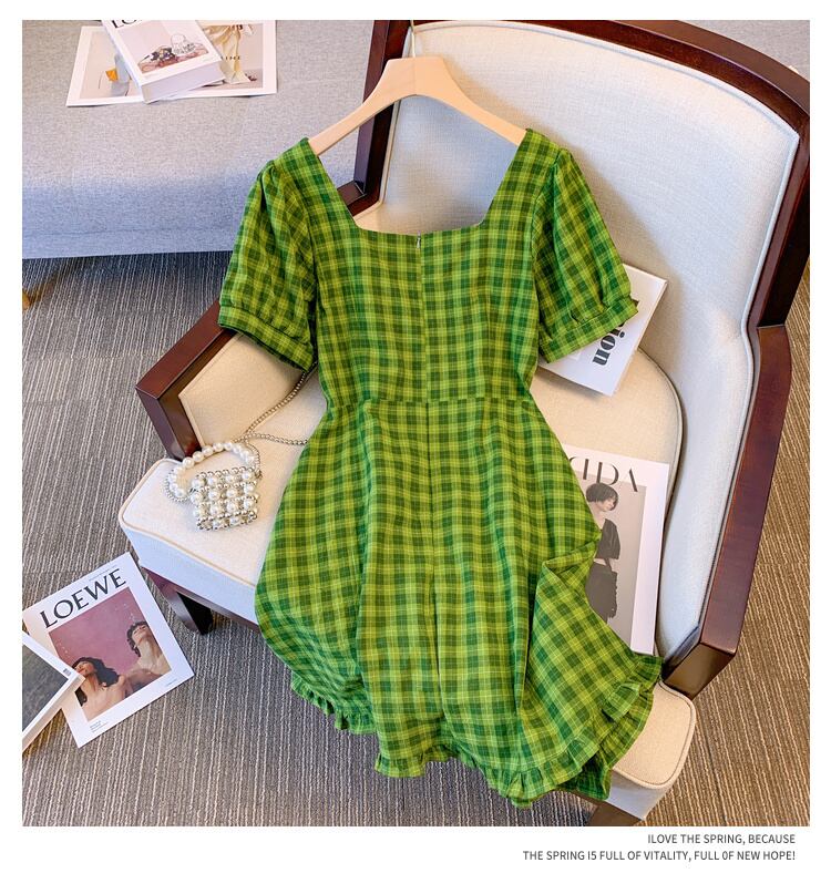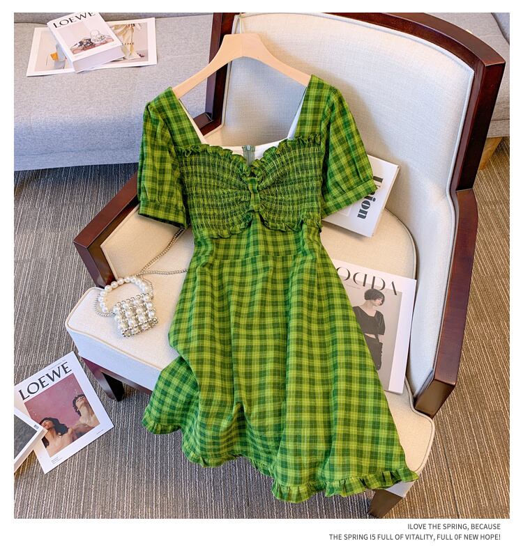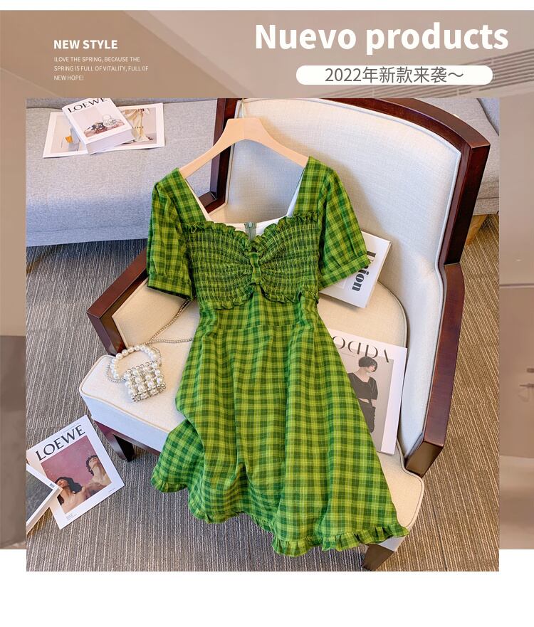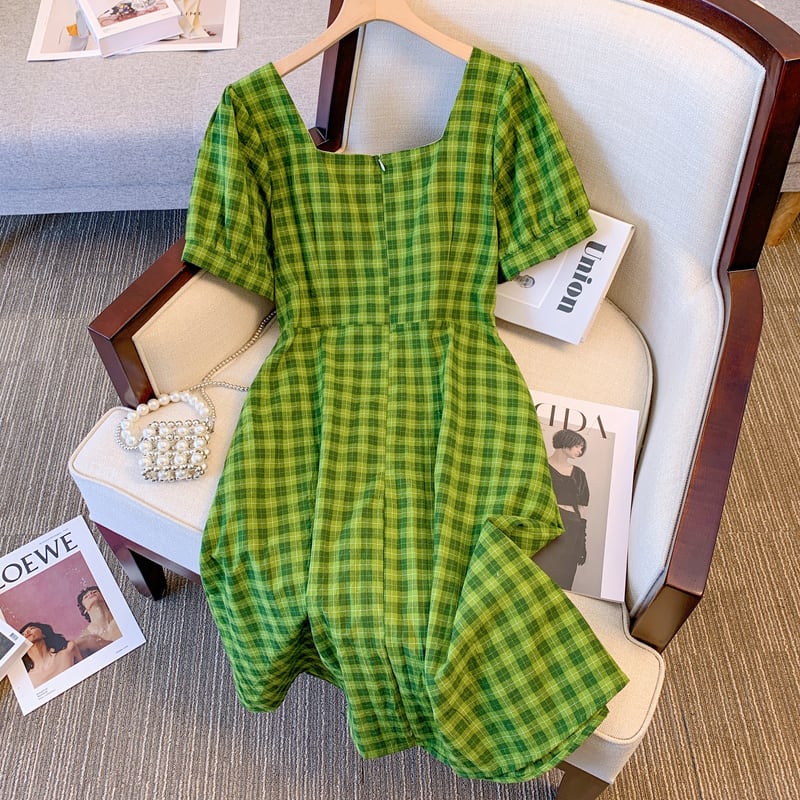 大サイズの婦人服 2022 夏の新しいファットシスターウエスト気質プリーツフレンチデザインの格子縞のドレスの女性 大きめサイズ サマー 夏物 8884136632830408