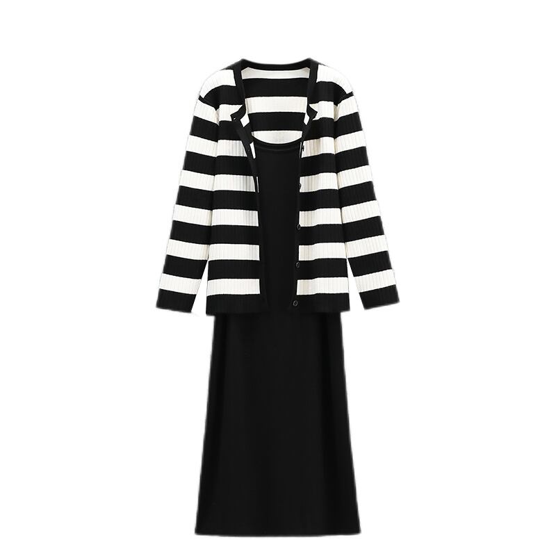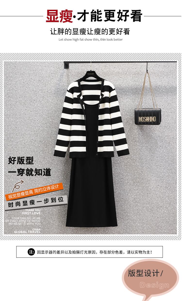 大サイズの婦人服 2022 秋の新ファットシスターストライプカーディガンセーター無地サスペンダードレスツーピース 大きめサイズ オータム 秋物 ソリッドカラー 8884130244175294