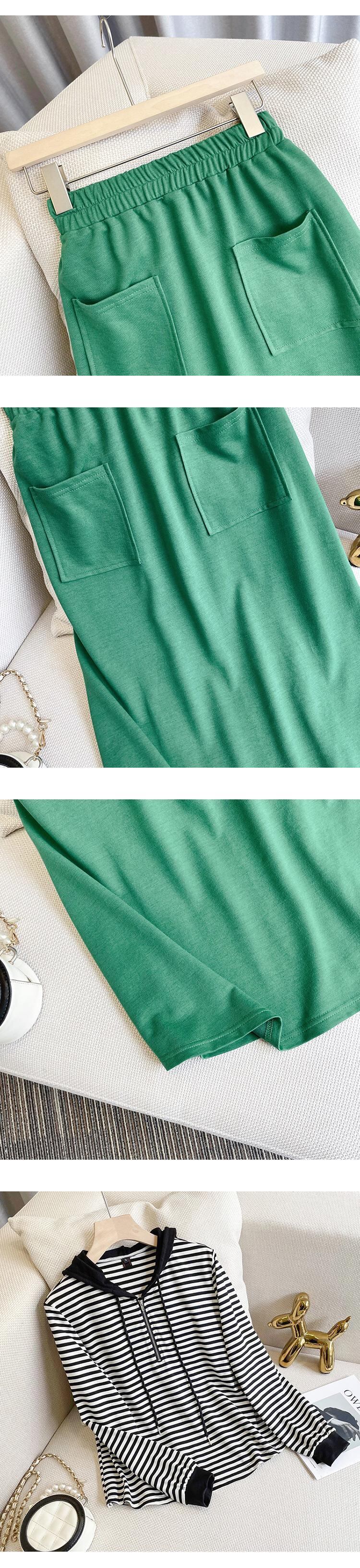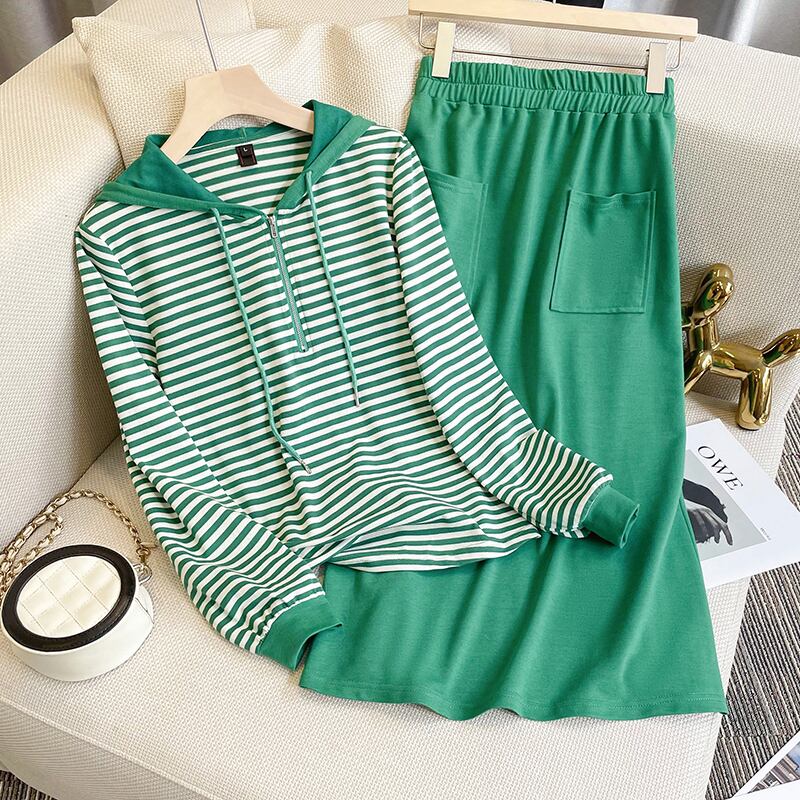 プラスサイズの婦人服 2022 ファットシスター秋の新カジュアルストライプフード付き長袖セータースカートツーピーススーツ ロング 大きめサイズ オータム 秋物 8884172822088177