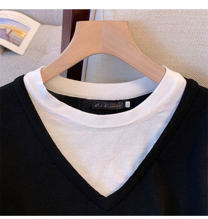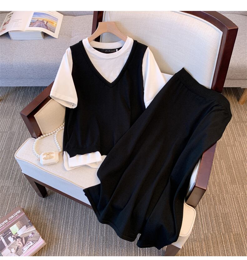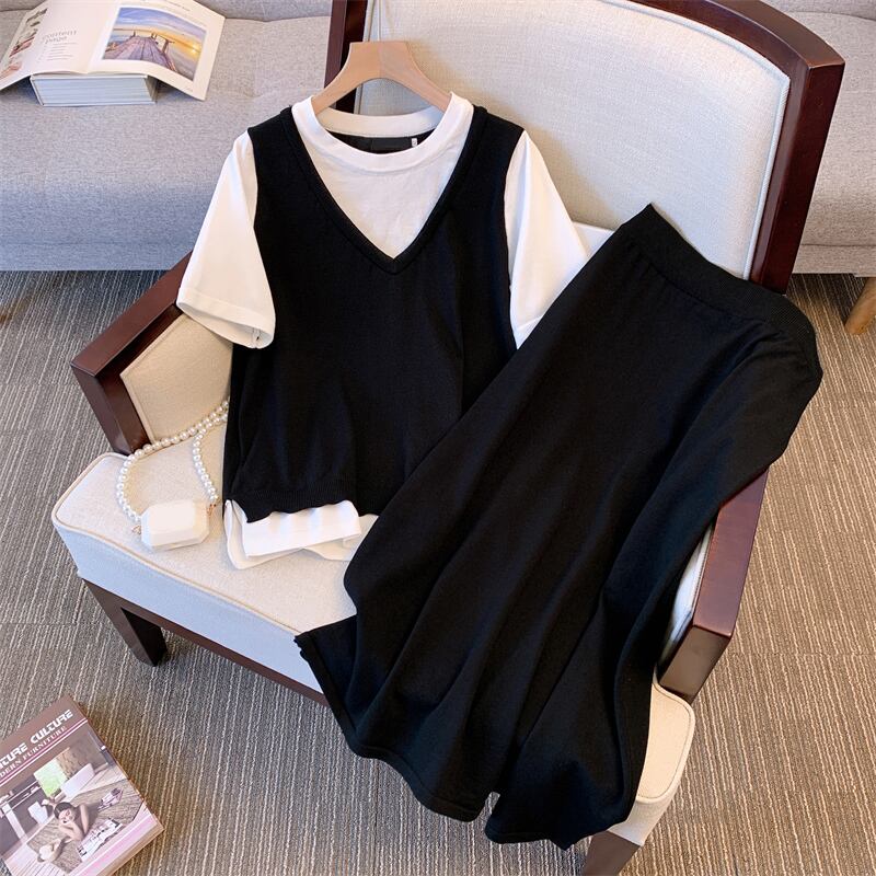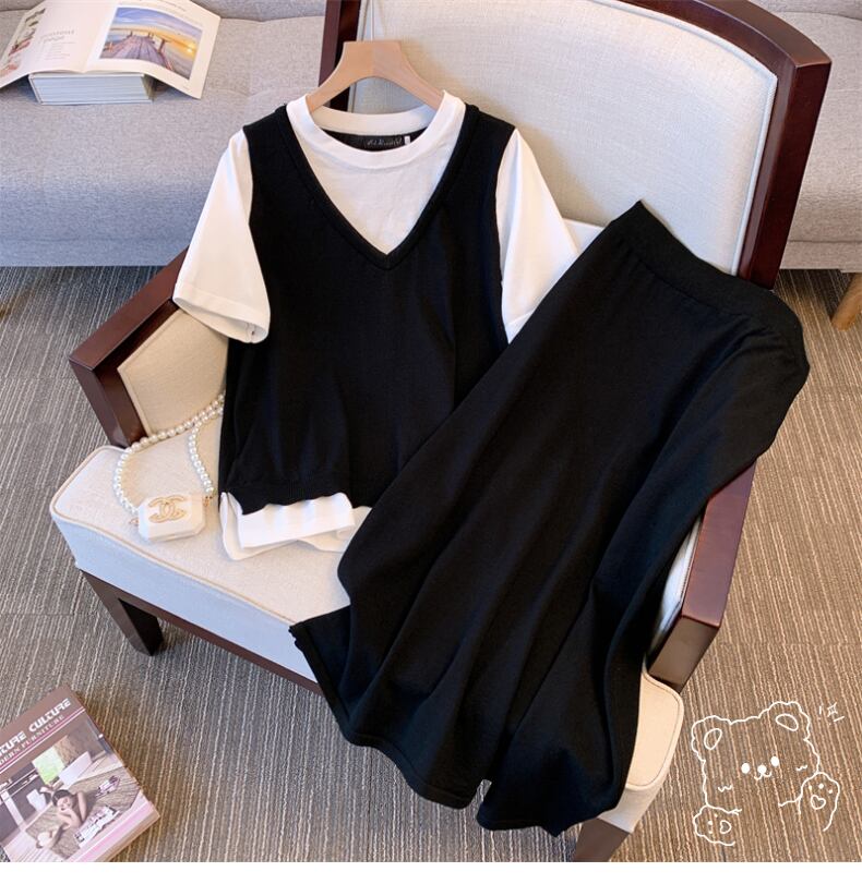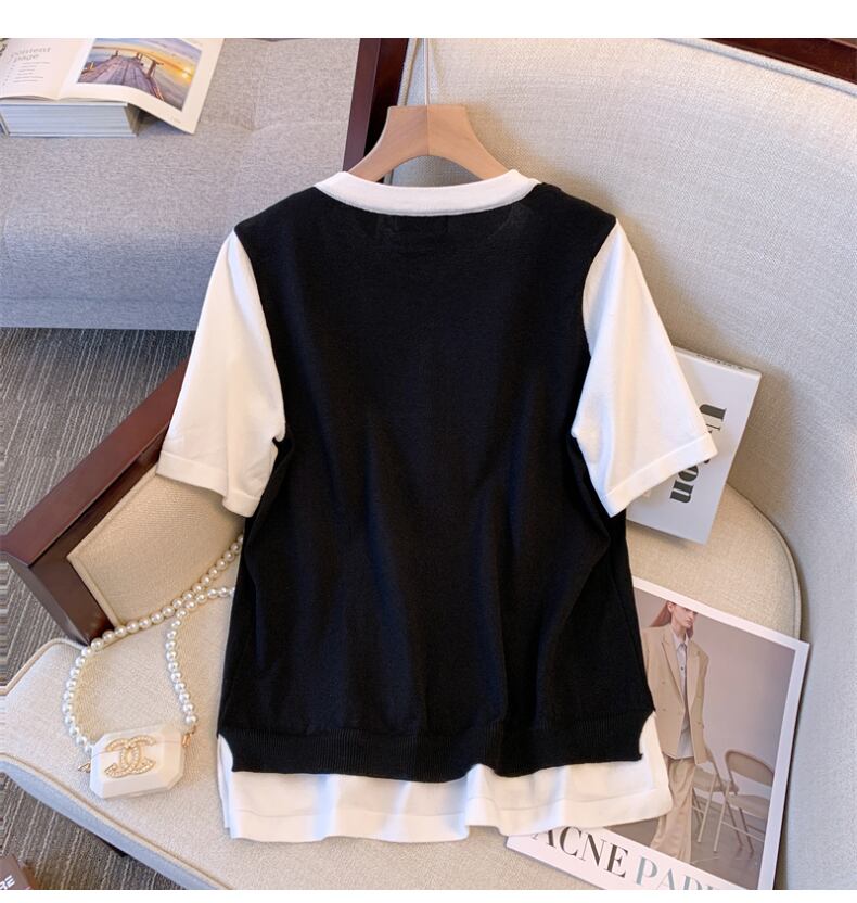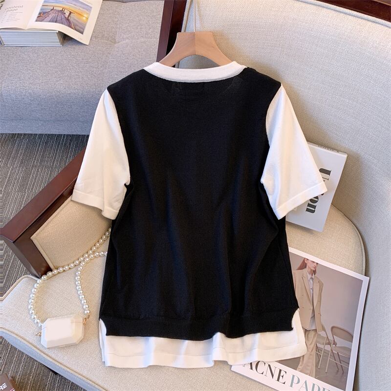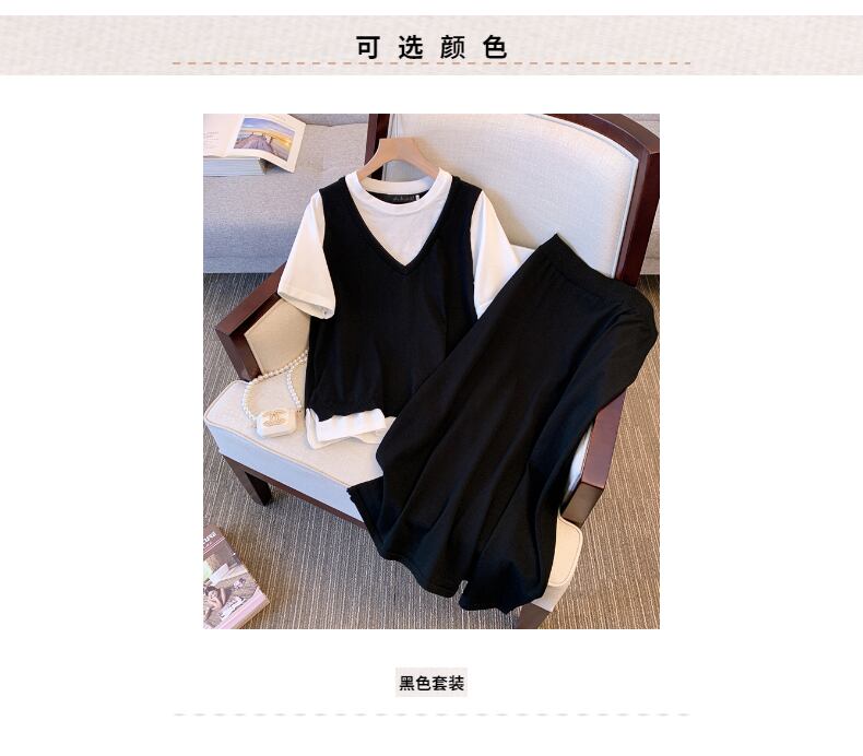 大サイズの婦人服 2022 ファットシスター夏新フェイクツーピースニットセータートップスとスカート痩身ツーピーススーツ 大きめサイズ サマー 夏物 888419871581621