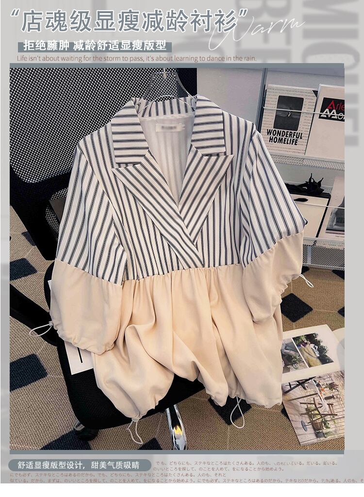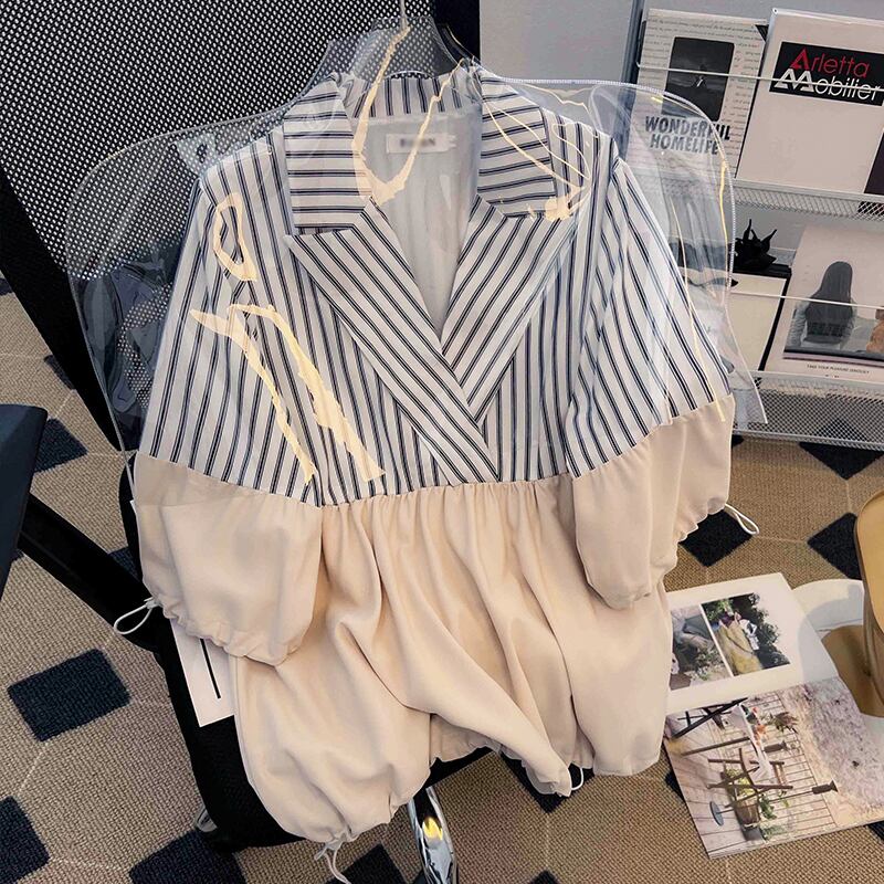 大サイズの婦人服 2022 ファットシスター夏の新フレンチファッションストライプステッチパフスリーブデザインセンストップ女性 大きめサイズ サマー 夏物 8884126822607371