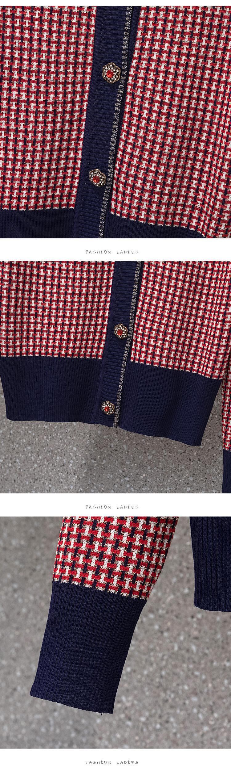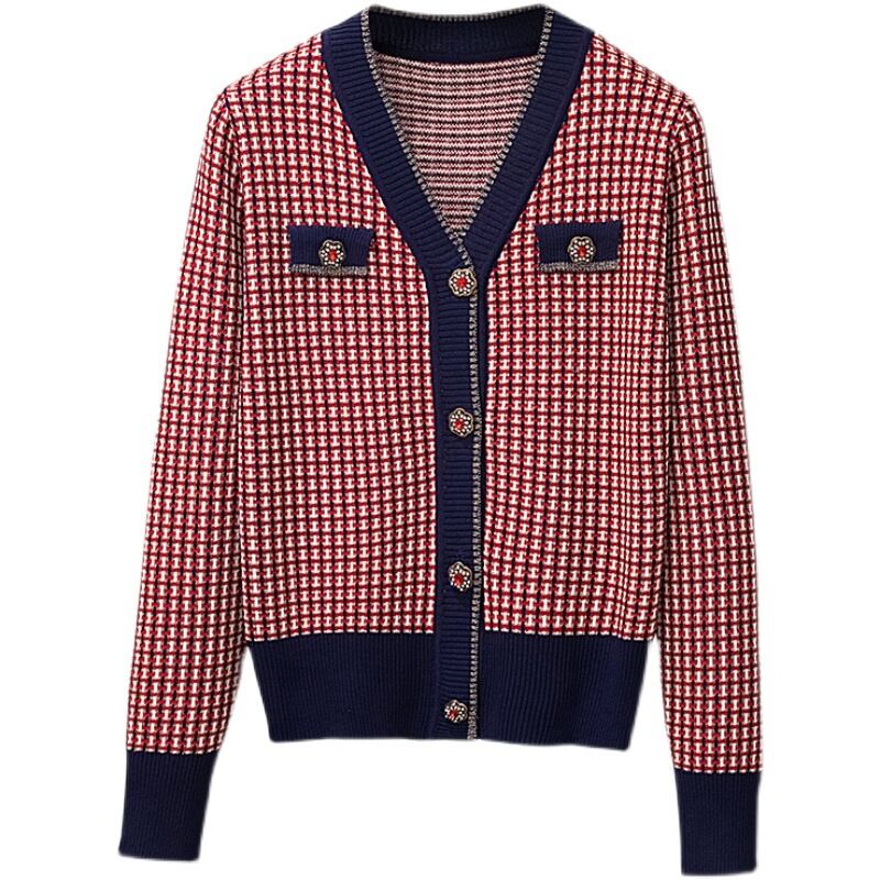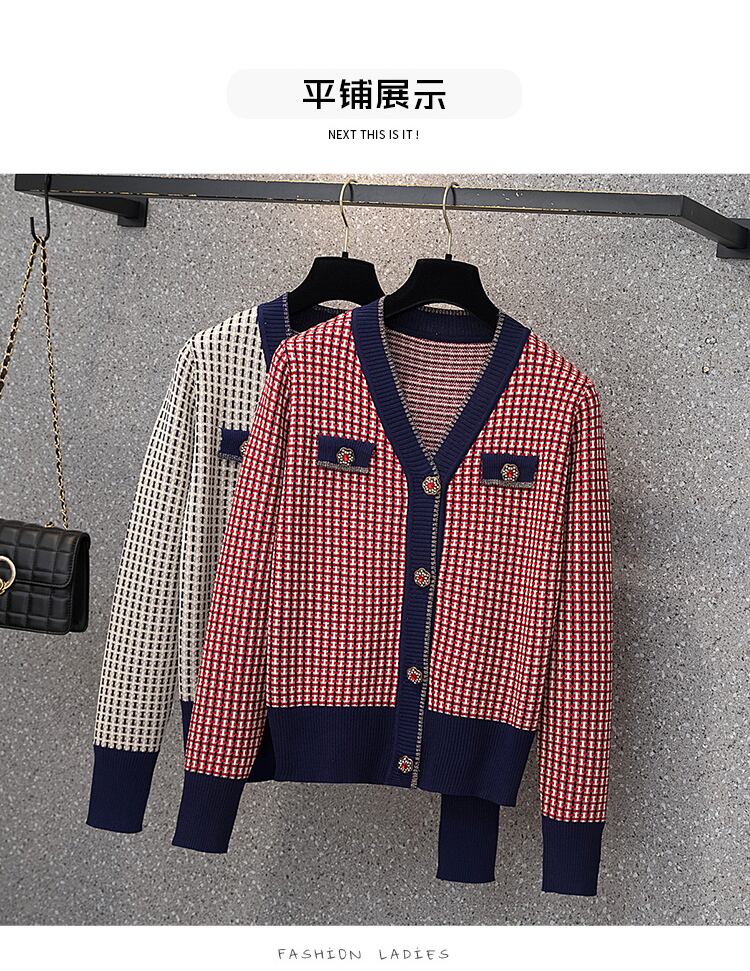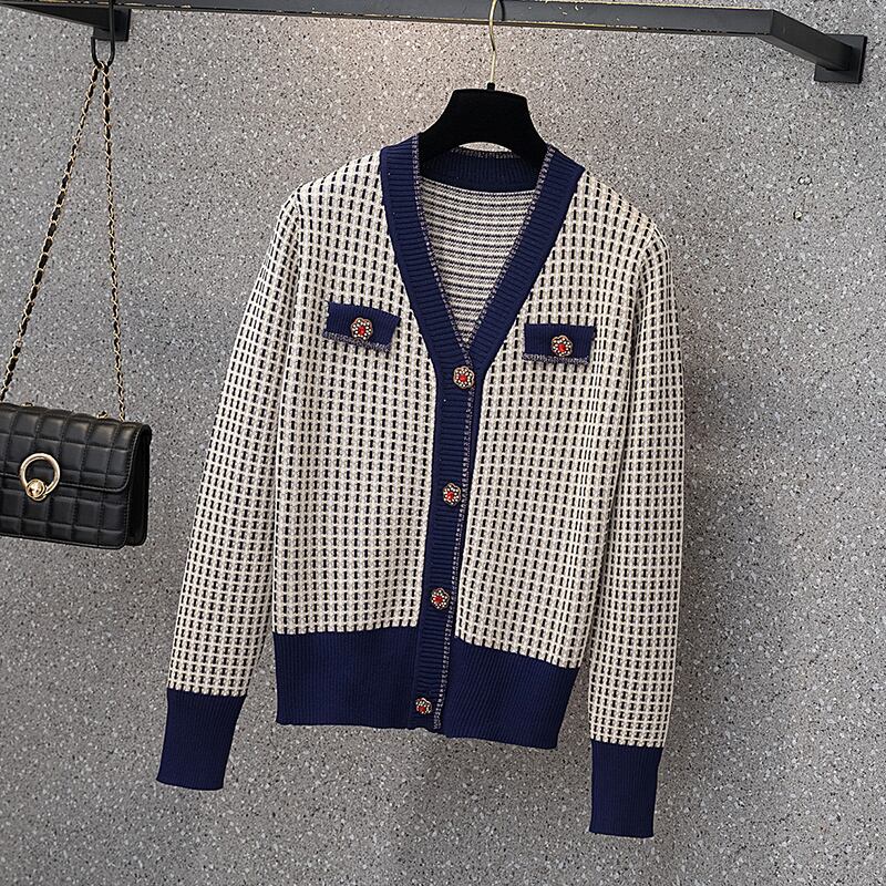 プラスサイズの婦人服 2022 脂肪姉妹秋新 v ネック長袖ニットカーディガンジャケット痩身チェック柄トップ女性 ロング 大きめサイズ オータム 秋物 Vネック 8884144611867062