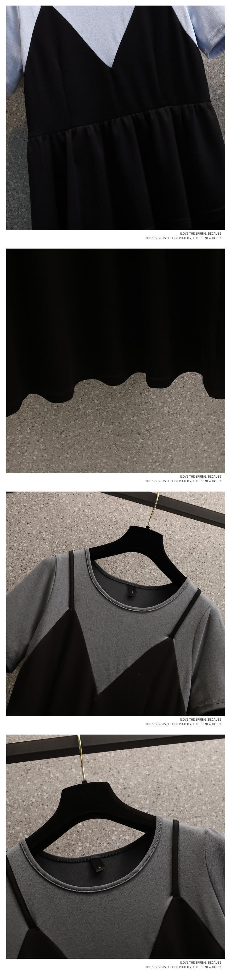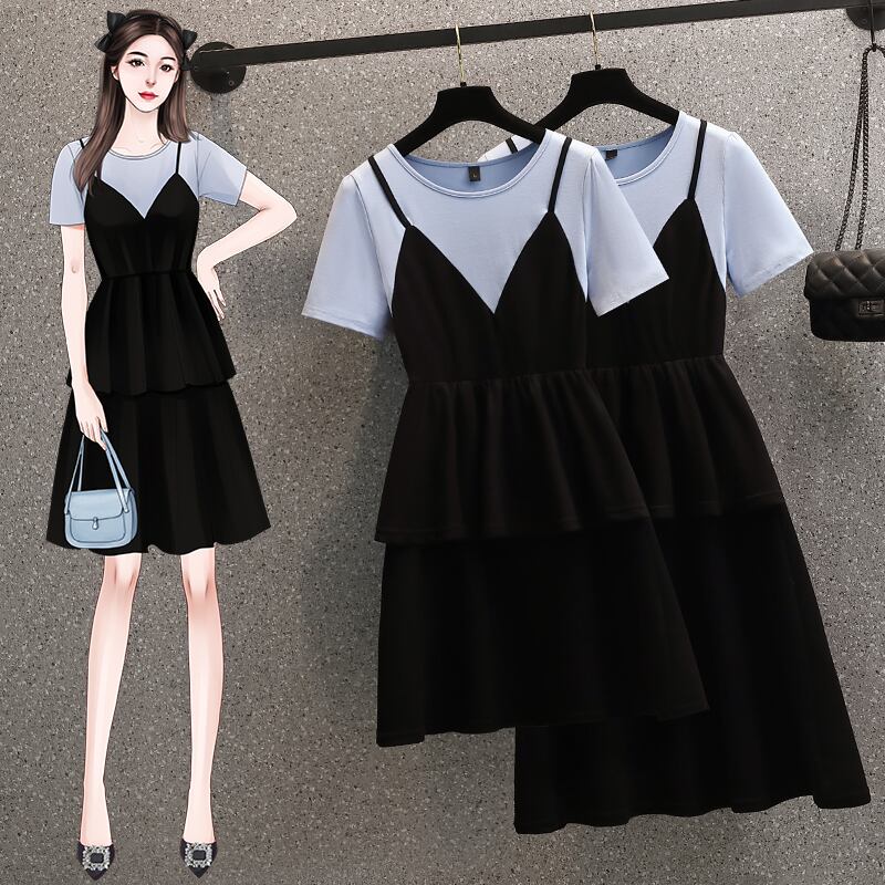 大きいサイズの婦人服 2022 夏新ファットシスターファッションステッチデザインセンスカバー腹偽 2 ウエストドレス 大きめサイズ サマー 夏物 8884129063280379
