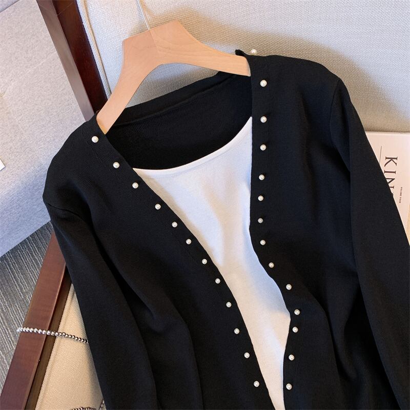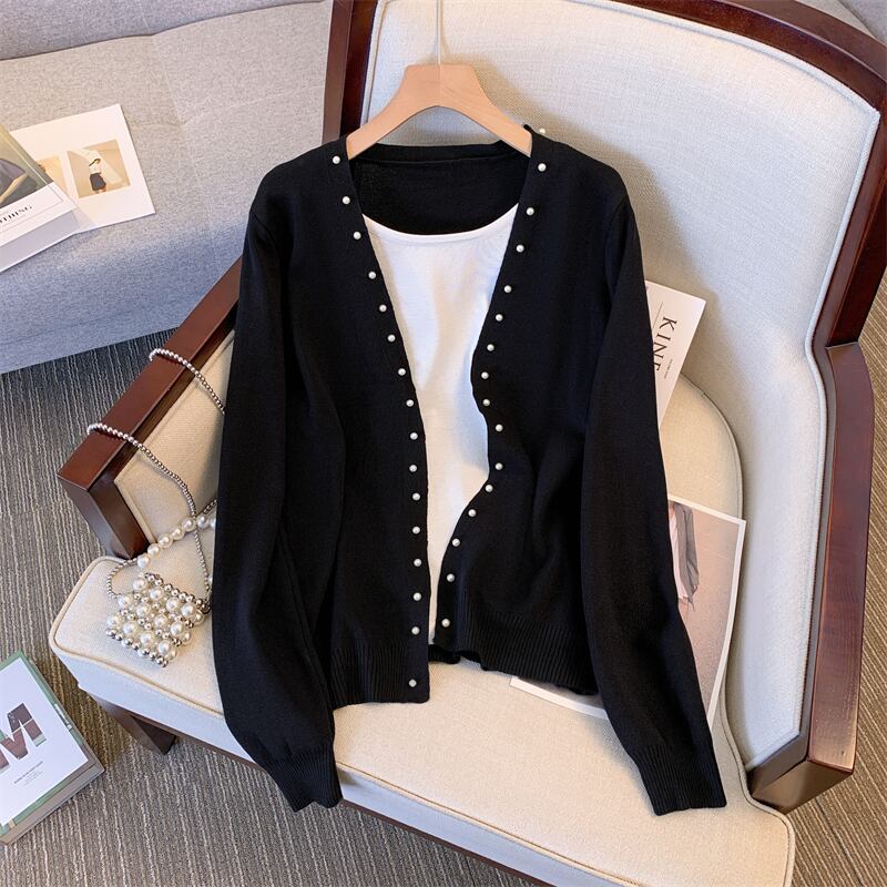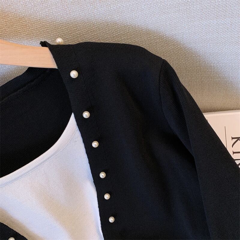 プラスサイズの婦人服 2023 ファットシスター春の新ファッションオールマッチ薄いフェイクツーピース長袖セータートップ ロング 大きめサイズ スプリング 春物 8884120505484993