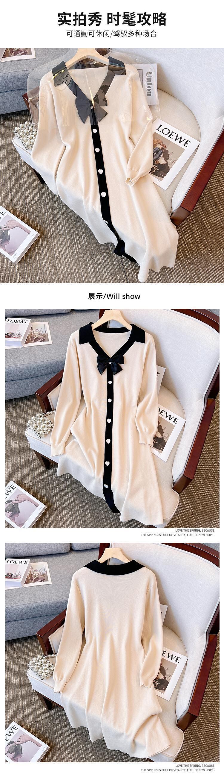プラスサイズの婦人服 2023 ファットシスター春の新色コントラストカラー痩身と年齢減少ちょう結び長袖ニットドレス ロング リボン 大きめサイズ スプリング 春物 8884160294256630