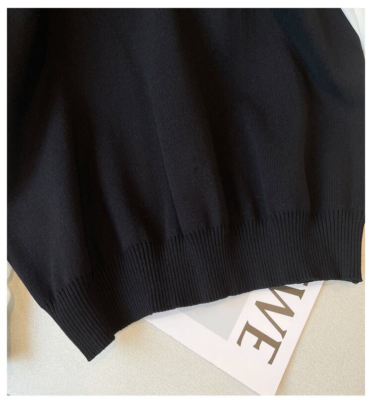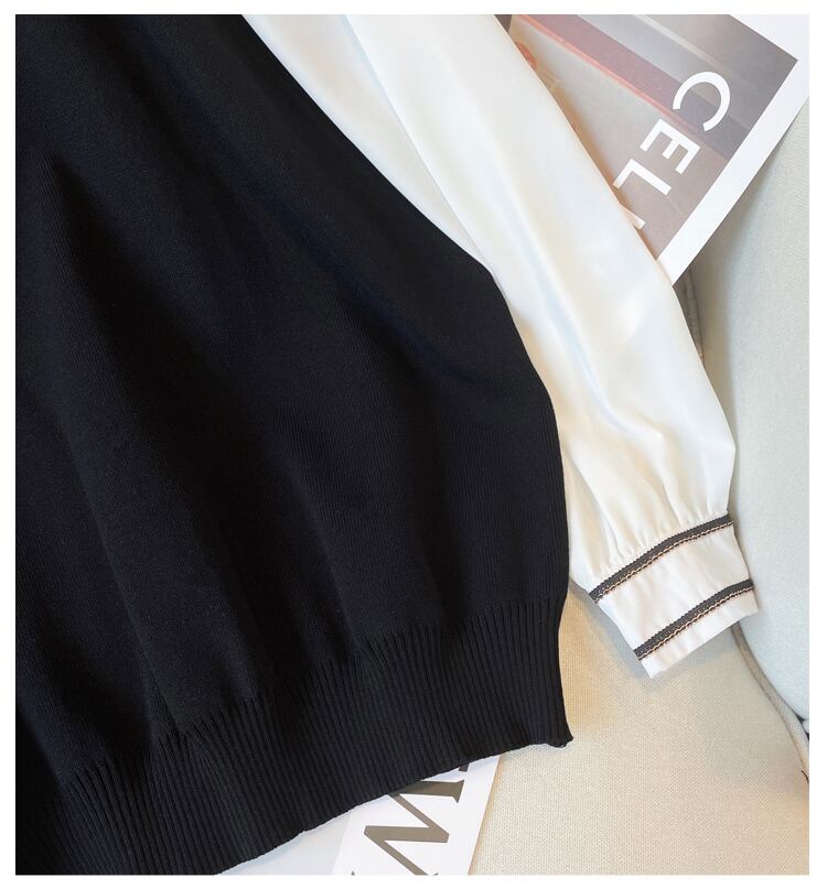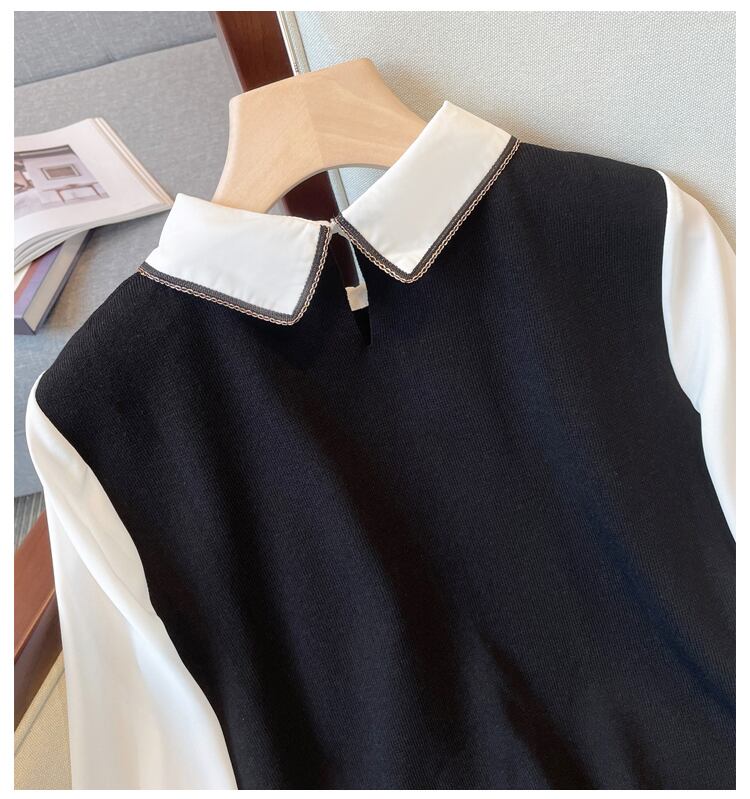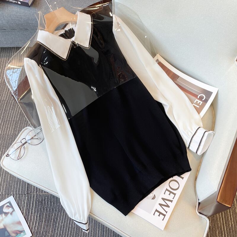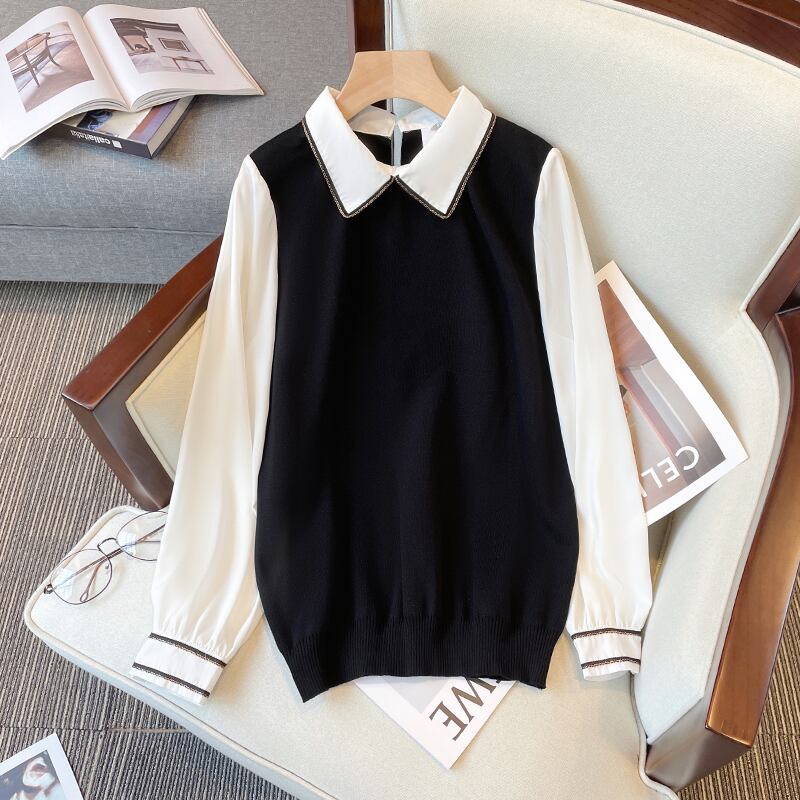 大きいサイズの婦人服 2023 トレンディな女性の春の新しいファット シスター 年齢を減らす休暇ツーピース スプライス オールマッチ シャツの襟ニット 大きめサイズ スプリング 春物 888417381572898