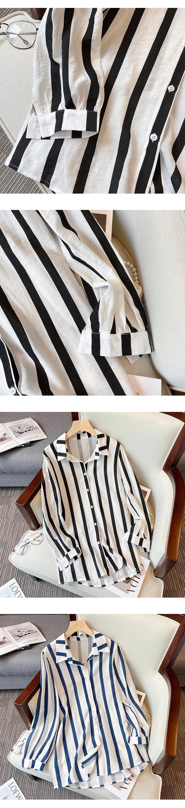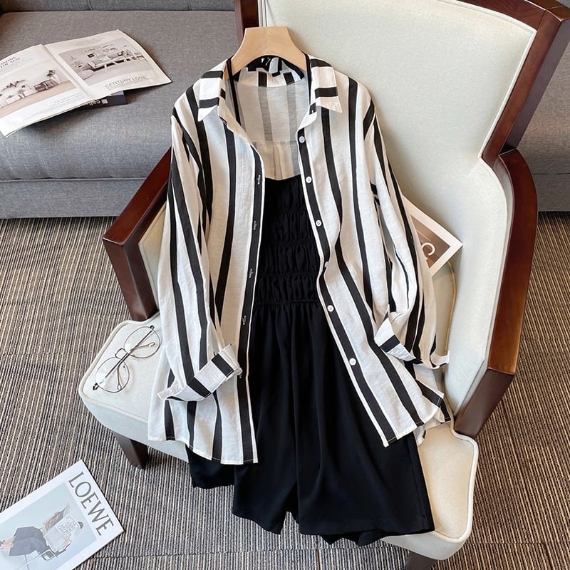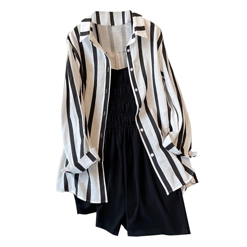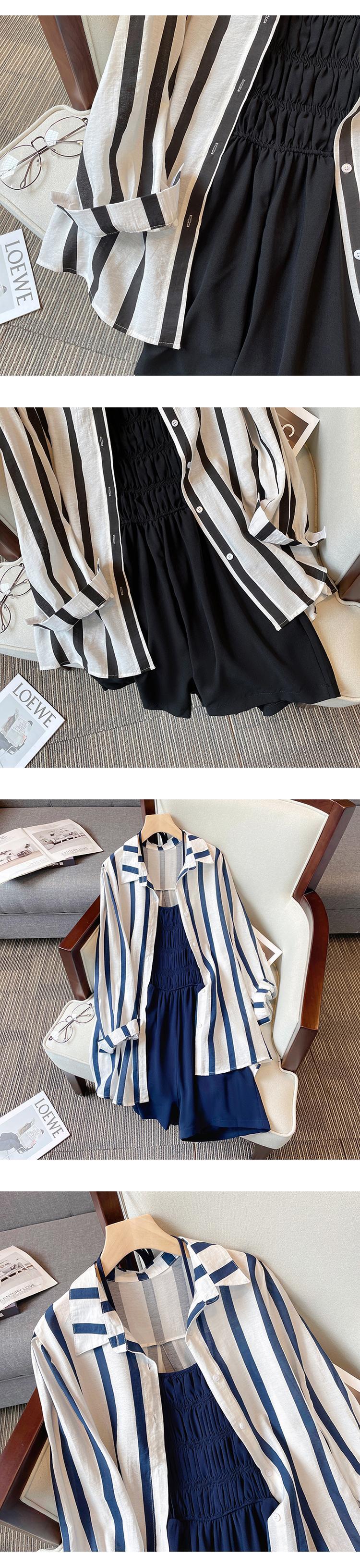 プラスサイズの婦人服 2023 トレンディな女性の春の新しい太った姉妹のファッション薄い気質のストライプのシャツのオーバーオール 2 点セット 大きめサイズ スプリング 春物 8884166090817943