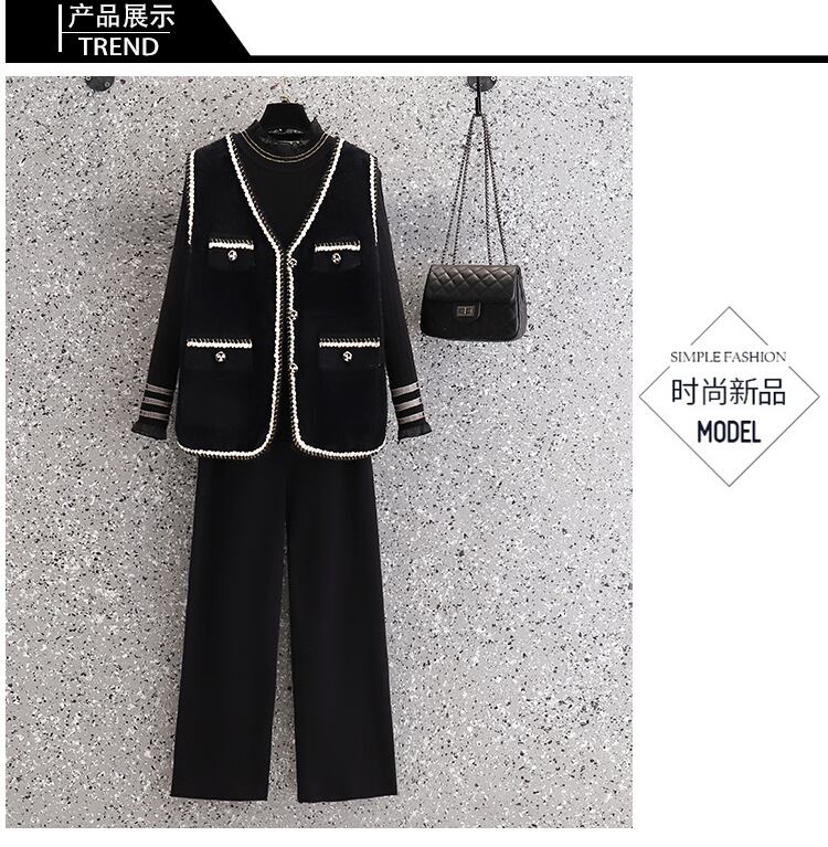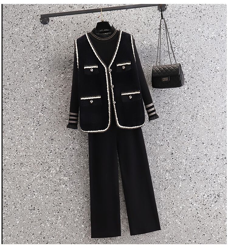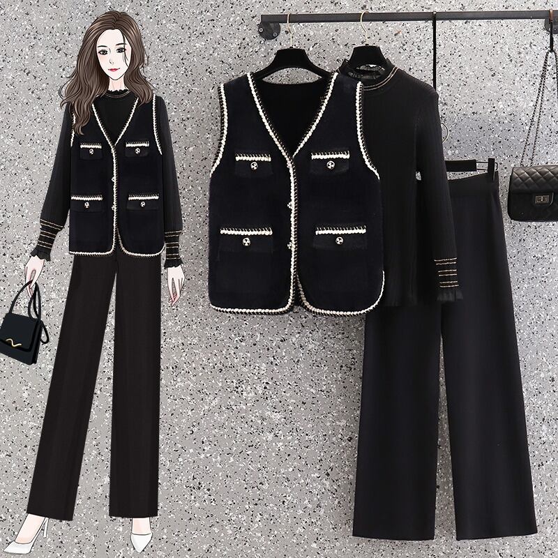 プラスサイズの婦人服 2023 トレンディな女性の春の新しいファットシスターファッショナブルなニットボトムスシャツベストワイドレッグパンツスリーピーススーツ 大きめサイズ スプリング 春物 8884133173592023