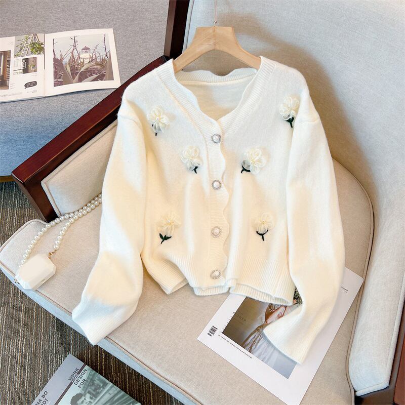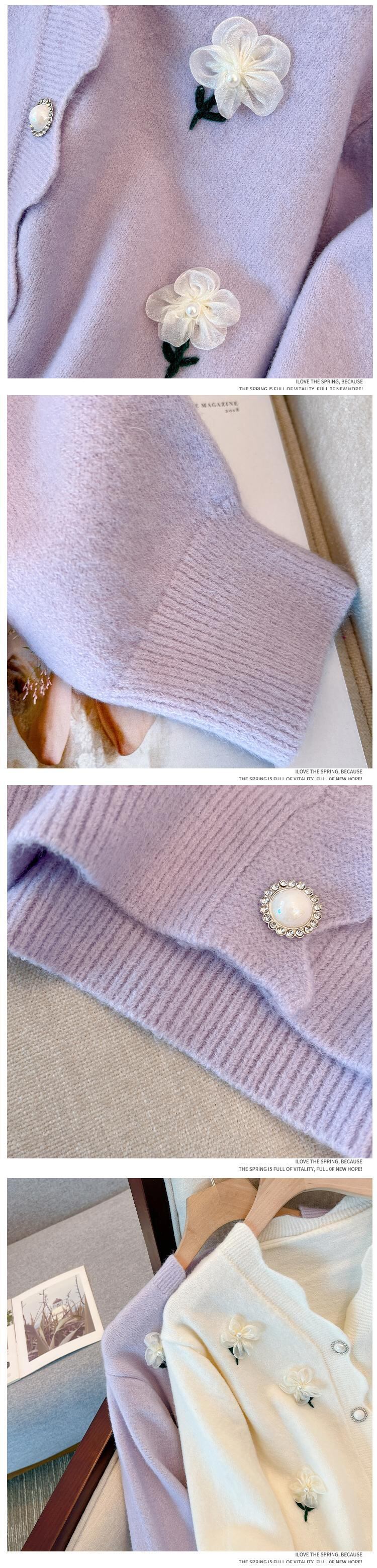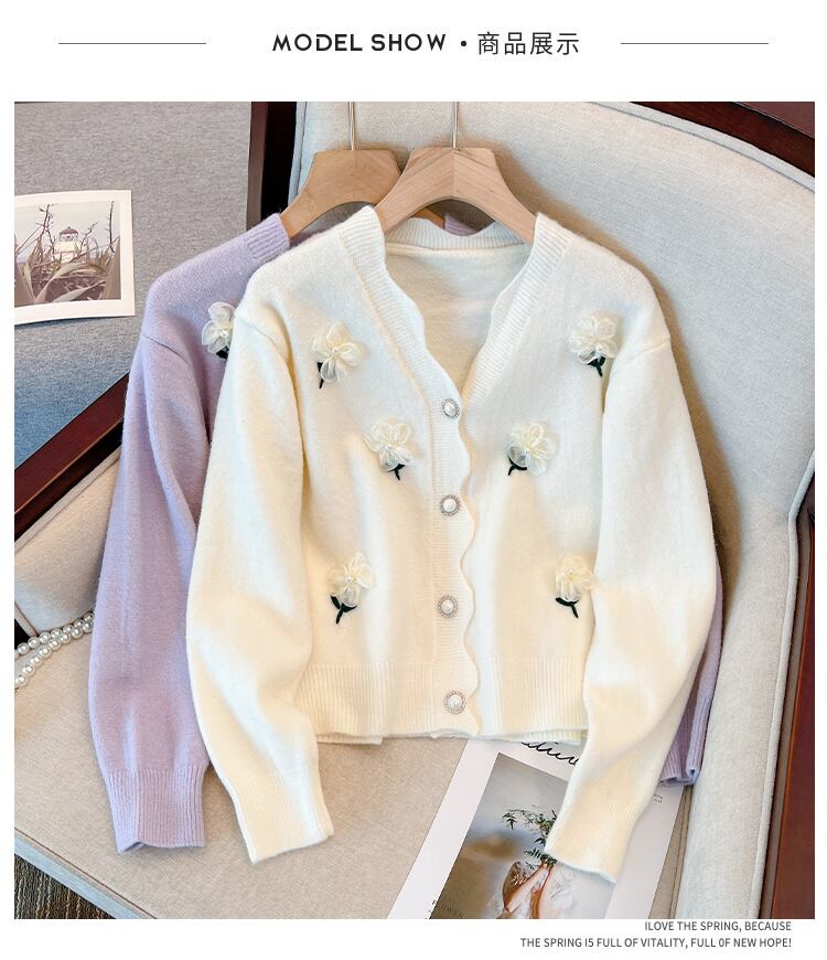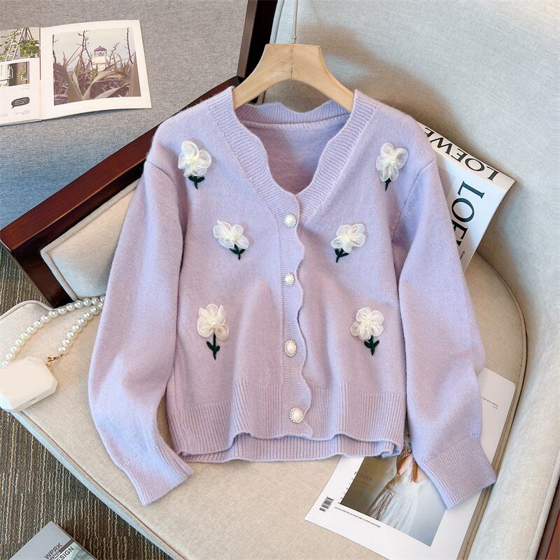 プラスサイズの女性の太った妹の春のかわいいカーディガンのトップのニットのセーターの立体的な花のゆったりとした薄いニットのセーター 大きめサイズ 大人ガーリー スウィート キュート カジュアル スプリング 春物 フラワーデザイン 8884194231266132