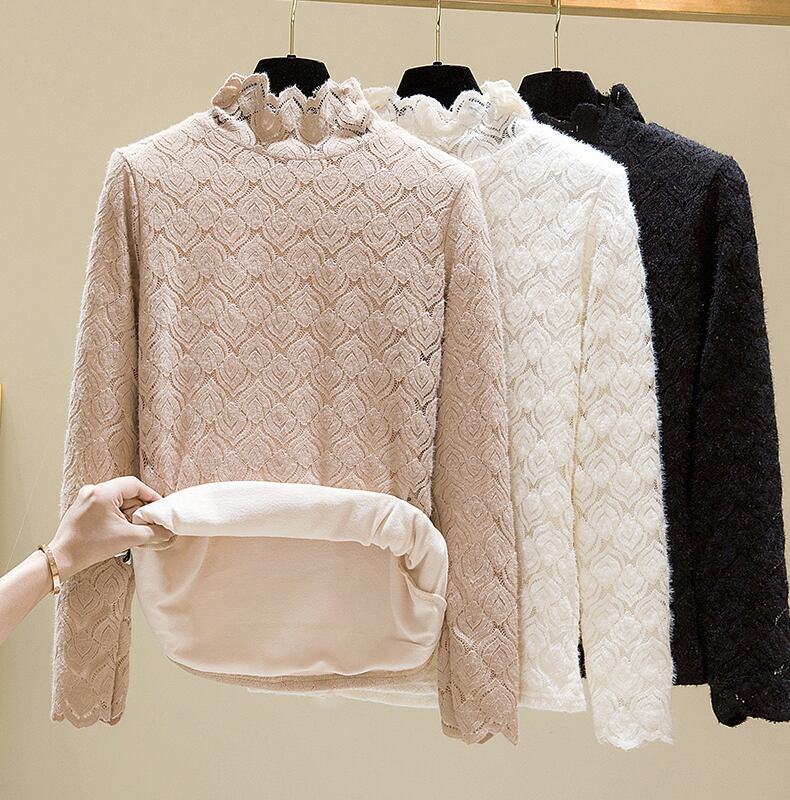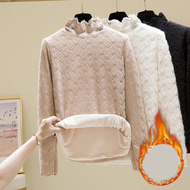 大きいサイズのハーフハイカラーレースボトムシャツ女性プラスベルベット肥厚内側 eign スタイル 2023 春カバー腹暖かいセーター 大きめサイズ スプリング 春物 8884130556757938