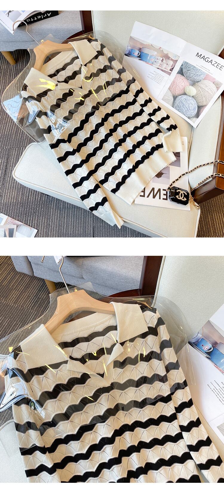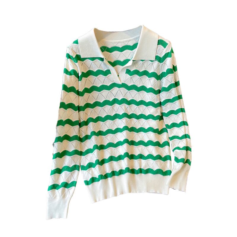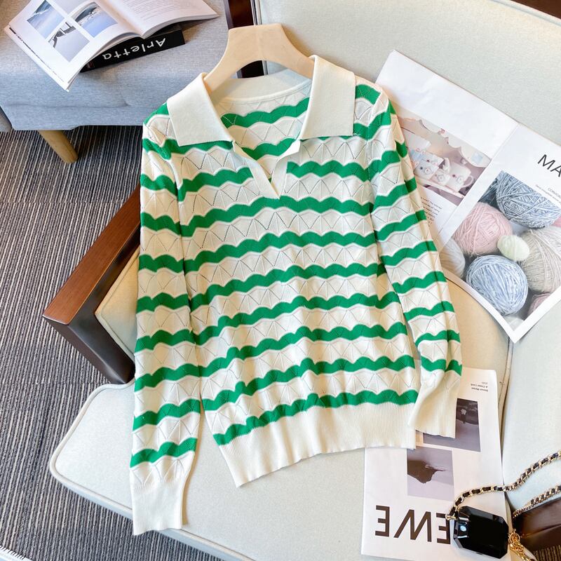 プラスサイズの婦人服 2023 脂肪姉妹春の新痩身ニッチポロ襟セータートップスストライプセーター女性 大きめサイズ スプリング 春物 8884172859434790