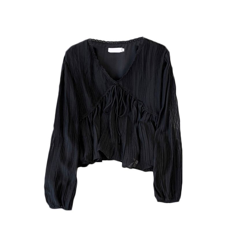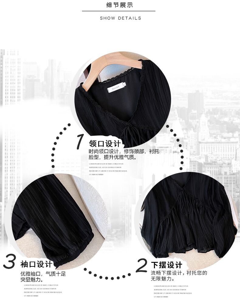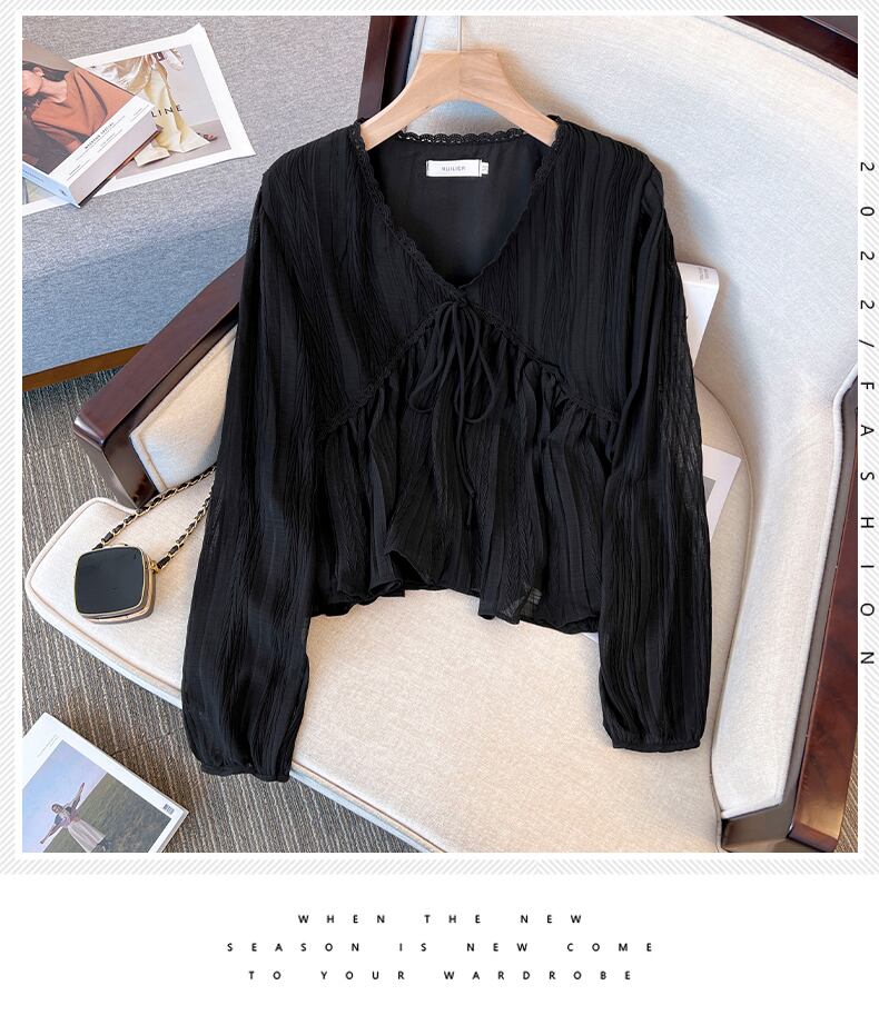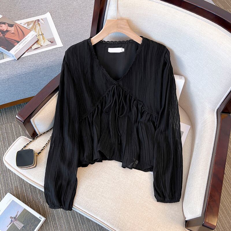 2023年春の大きいサイズの婦人服新しい脂肪は肉をカバーしますゆったりとした薄い長袖のVネックのシックな無地のシャツ ロング 大きめサイズ スプリング 春物 ソリッドカラー 8884139508262348