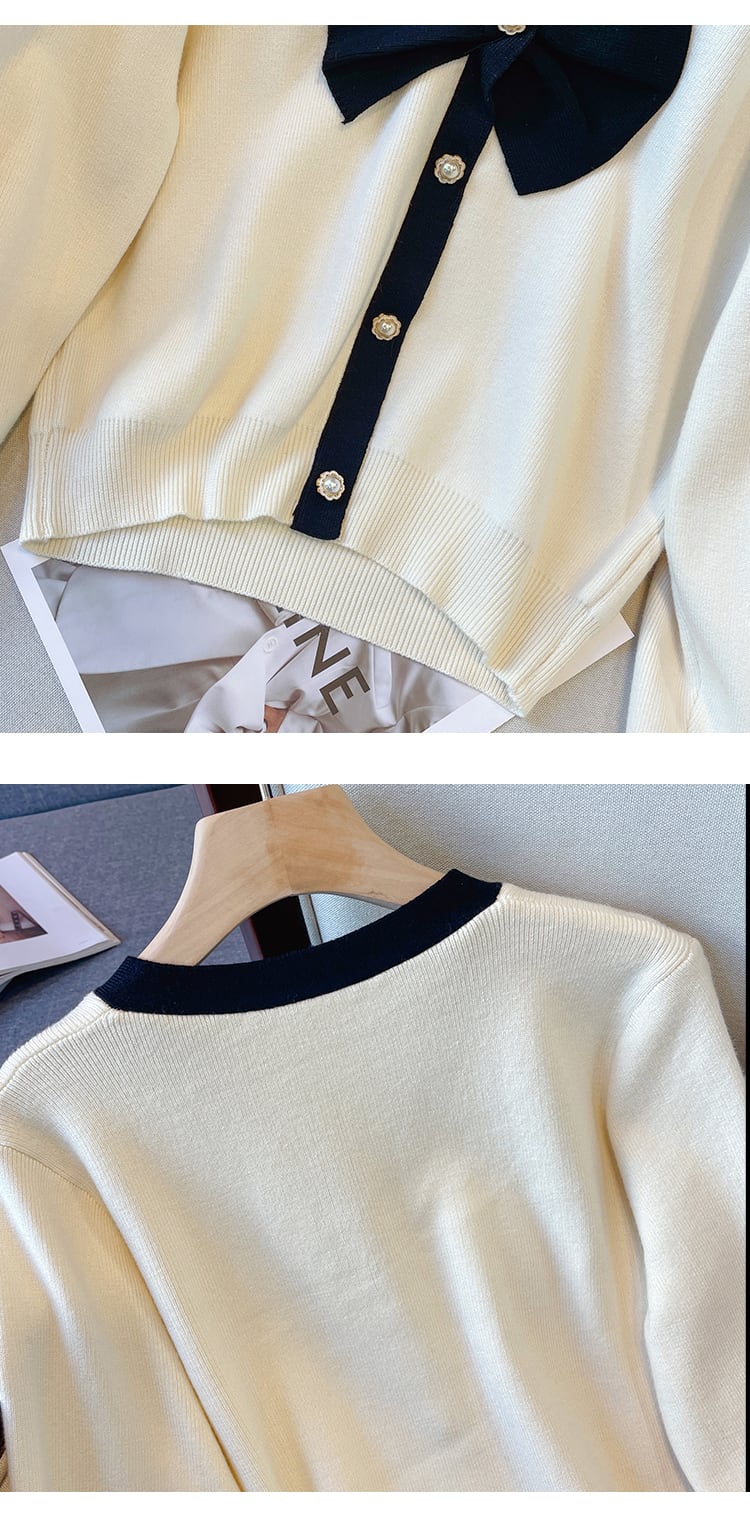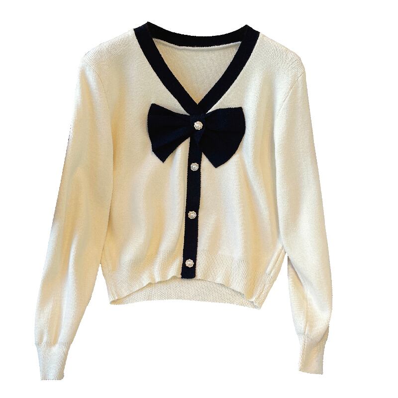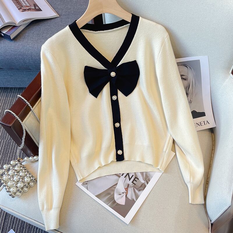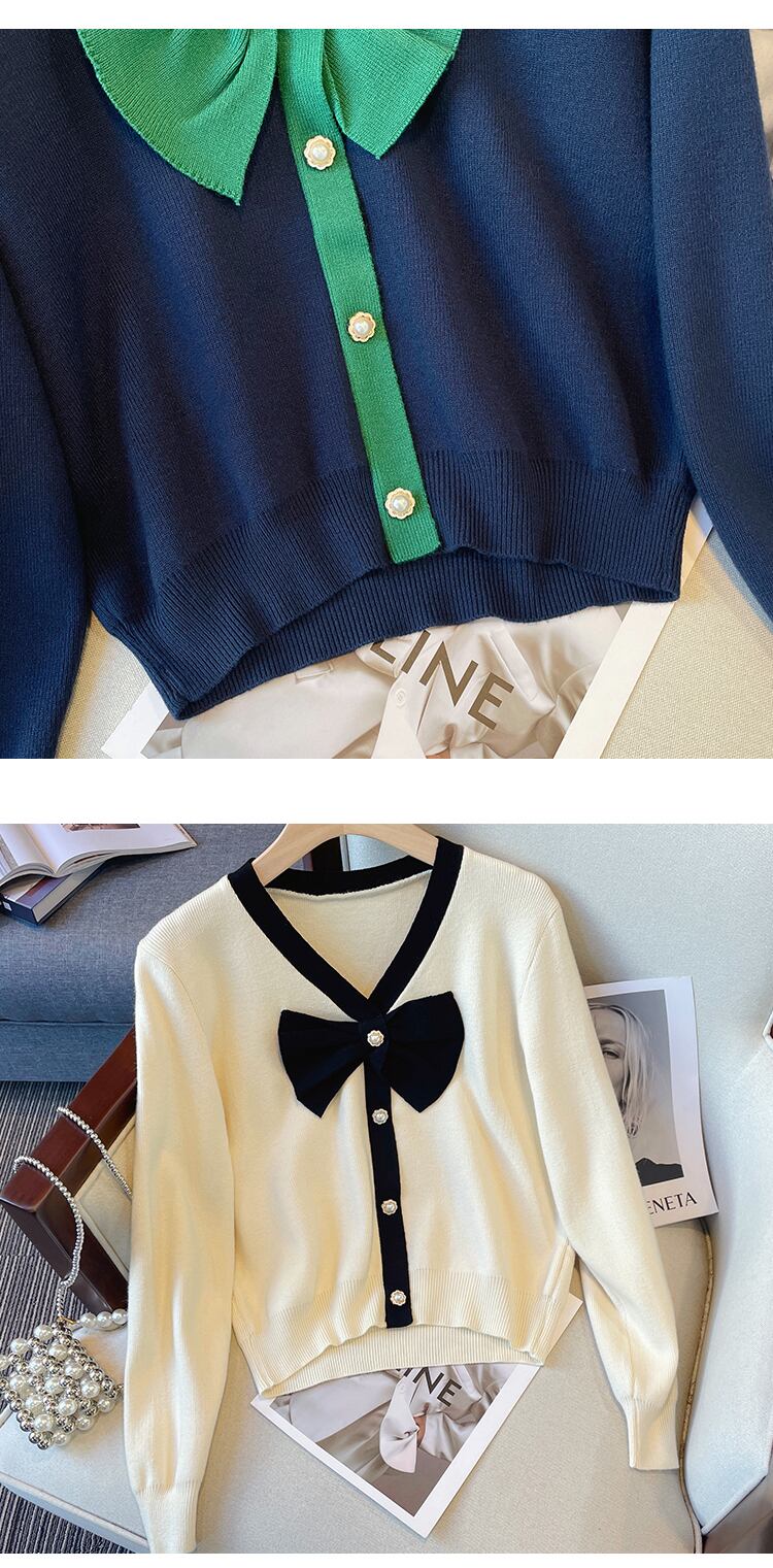 プラスサイズの婦人服 2023 春の新スタイル脂肪姉妹スプライシングコントラストカラーデザインちょう結びニットカーディガントップ女性 リボン 大きめサイズ スプリング 春物 8884113368000483