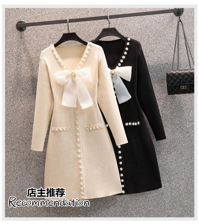 プラスサイズの婦人服 2023 トレンディな女性の春の新しいファットシスター eign スタイルのビーズちょう結びの年齢を減らすニットドレス リボン 大きめサイズ スプリング 春物 8884171645852651