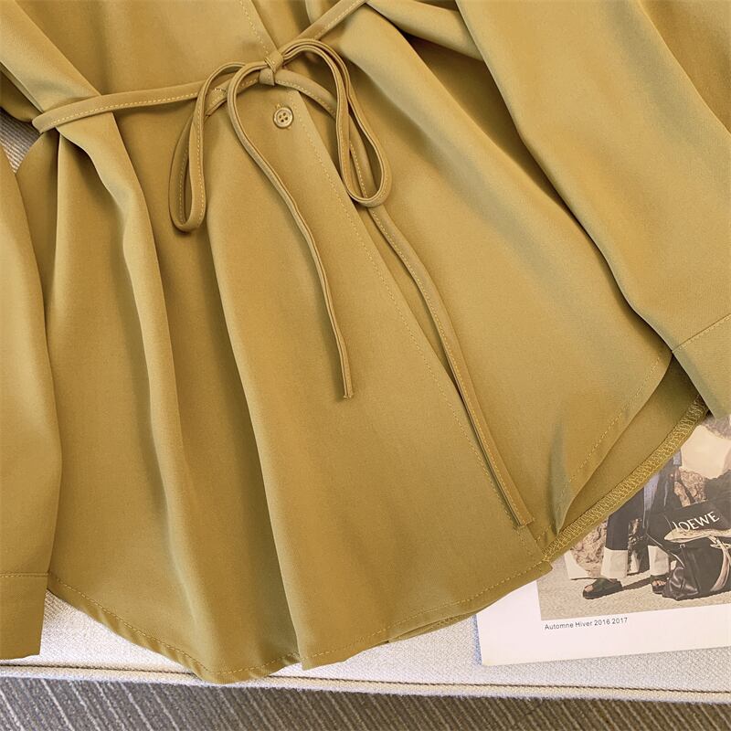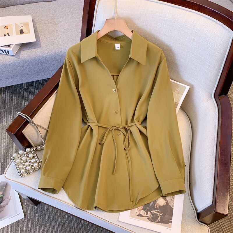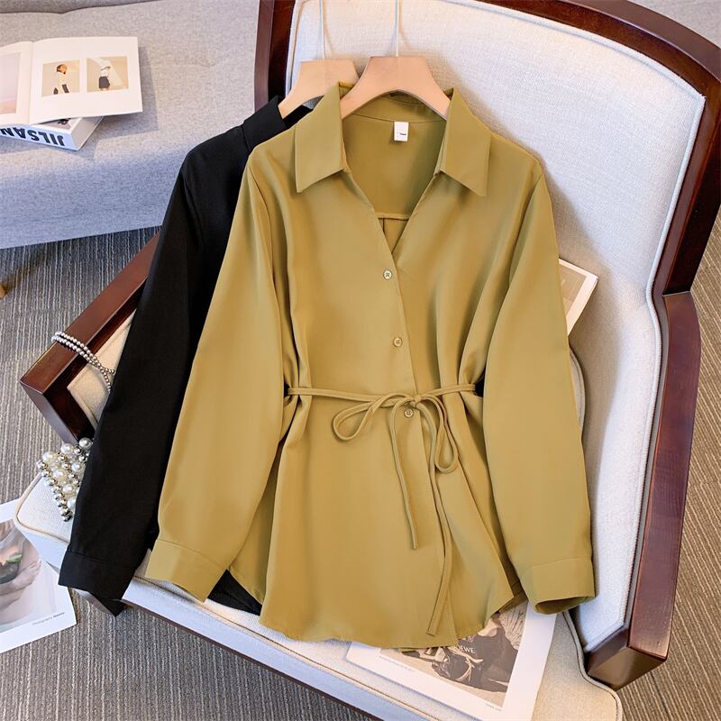 プラスサイズの婦人服 2023 春の新ファットシスターデザインセンスベルトスリムフィットオールマッチ気質無地シャツ女性 大きめサイズ スプリング 春物 ハーネス ソリッドカラー 8884193195166731