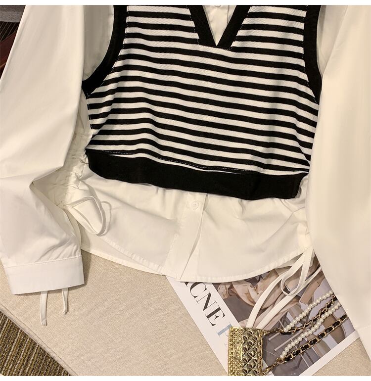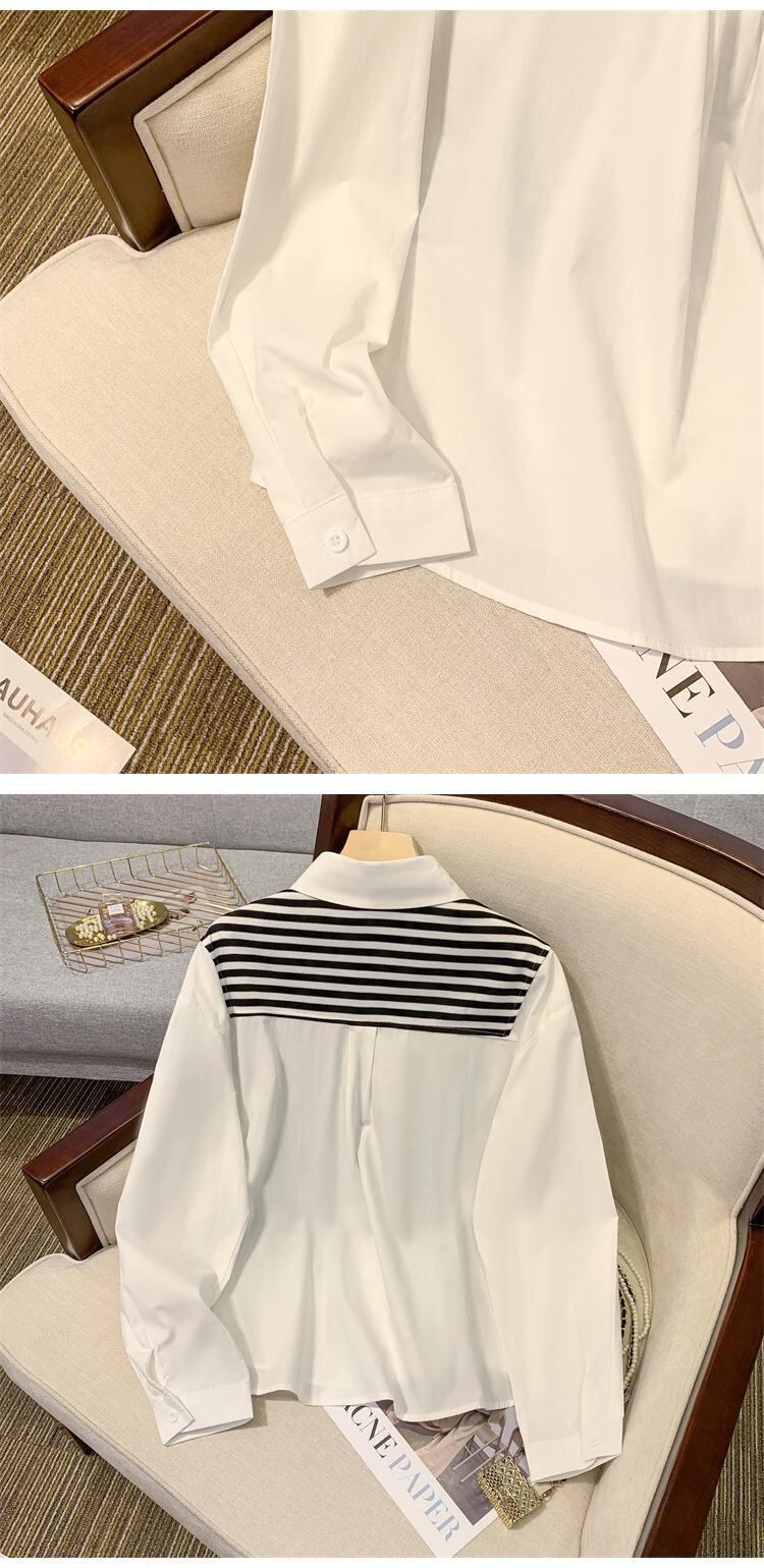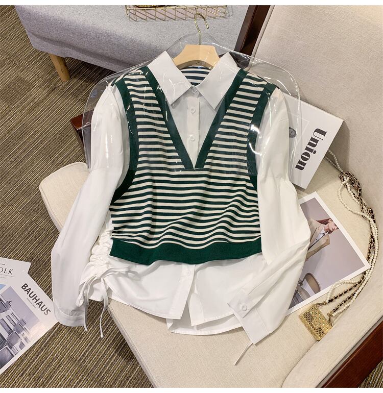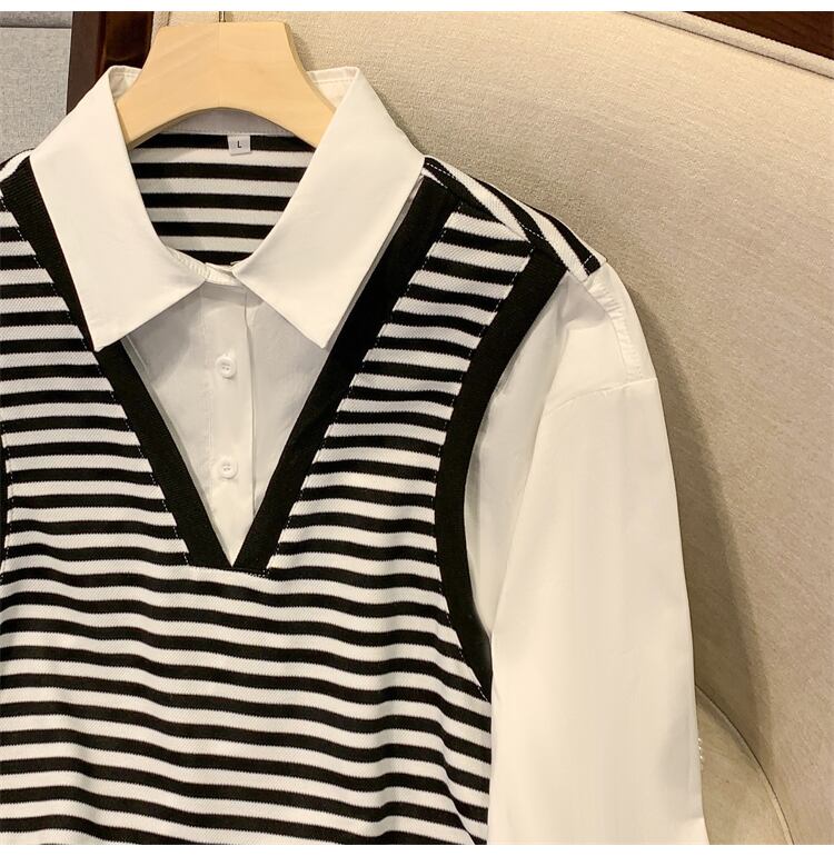 プラスサイズの婦人服 2023 ファットシスター春の新しい偽ツーピーススプライシングストライプ巾着ネクタイデザインセンスシャツ女性 大きめサイズ スプリング 春物 8884182712825250